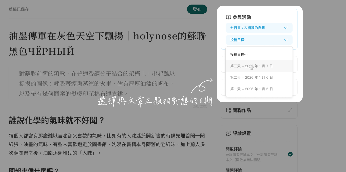 每篇文章對應一天,七篇文章對應七天。例如你今天寫的題目是「第二天:寫一次你在服飾店試穿衣服,感到焦慮或挫敗的經驗。」,發文時就可以選擇「第二天 - 2026 年 1 月 6 日」。