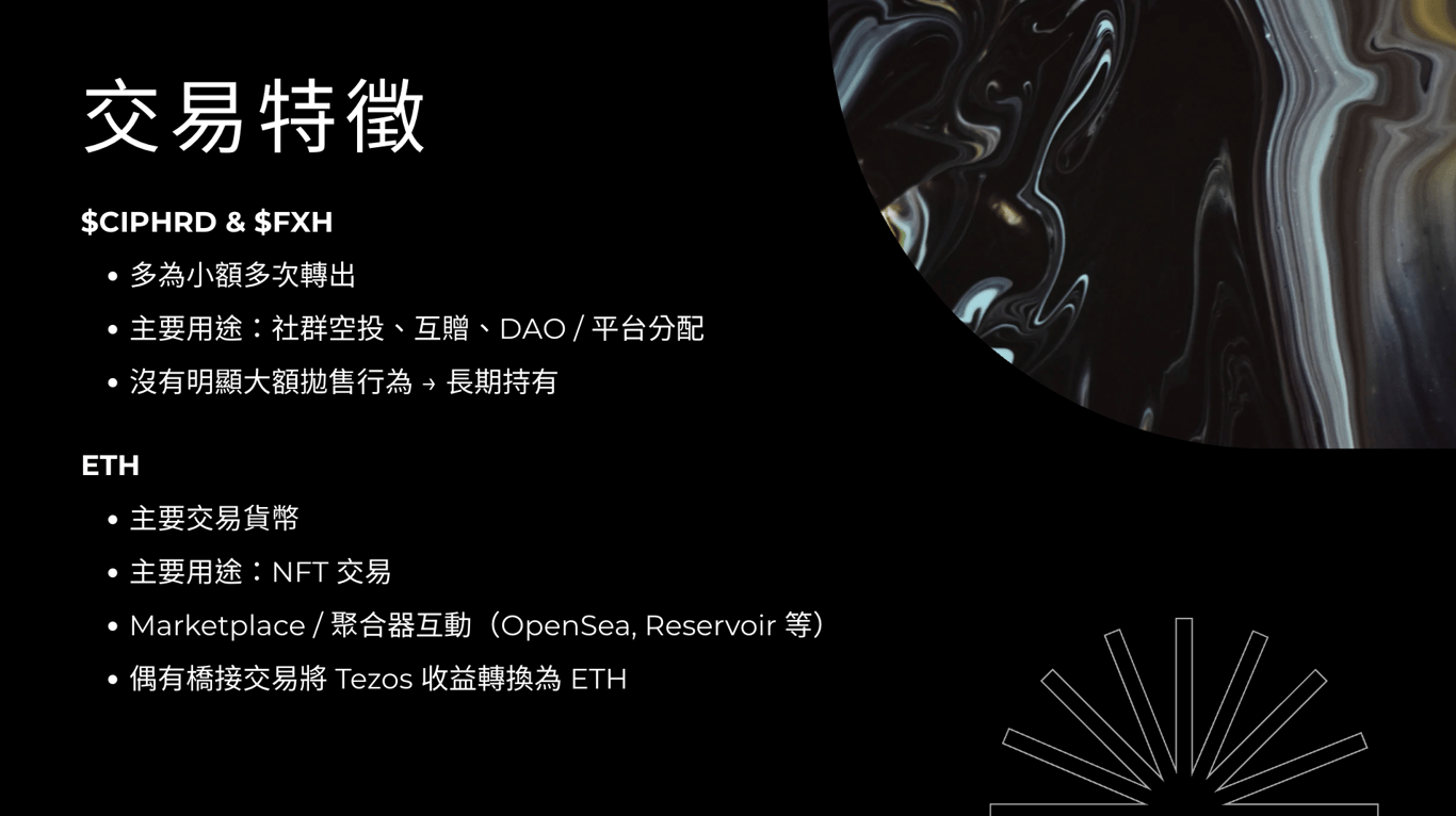 從去年底到今年初,fxhash 推出多項新機制,包括平台原生代幣 $FXH 與藝術家自發行的 Art Coin。作為創辦人,Ciphrd 同時也是活躍的藝術家與收藏者,他在平台上持有的主要代幣為 FXH 與 $CIPHRD,而其交易紀錄顯示,他多以小額、頻繁轉出的方式進行互動,例如空投、互贈與獎勵,反映出他對社群的長期經營與共享精神。