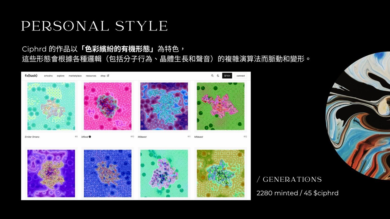Crespy 解釋這個名字是自己被編碼後的另一個版本,也是以程式語言重新組合的自我,同時象徵他透過演算法探索生命樣態、系統秩序與自我生成的邊界的創作風格。而透過創立 fxhash,他讓藝術家能用程式創作並發行 NFT,Crespy 希望這不只是一個交易平台,也可以是推動生成藝術文化的重要社群。