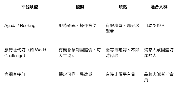 看起來旅行社最便宜,但如果你可能改行程、怕臨時變卦,那這個方案反而不適合。所以一定要先想清楚自己需要什麼,再去比價。