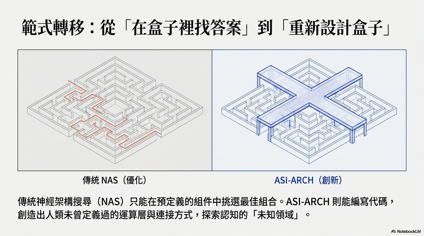 突破人類限制: 傳統的自動化搜尋(NAS)只能在人類預先定義好的「框框」內挑選最佳組合。但 ASI-ARCH 能自主提出新穎的架構假設並編寫代碼,這意味著它是在探索人類直覺尚未觸及的「未知領域」,。