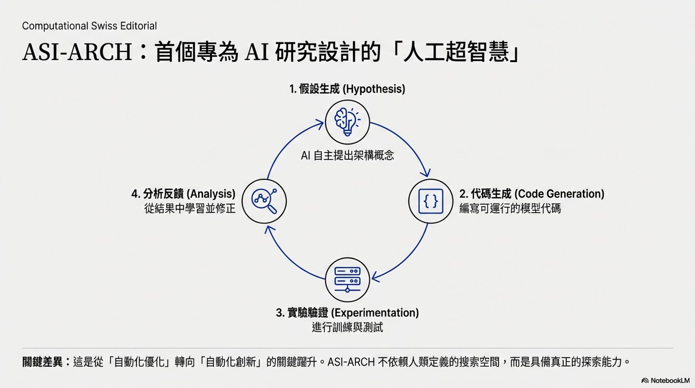 如果說人類的直覺是基於有限經驗的「感官判斷」,那麼 ASI-ARCH 的直覺就是基於大規模數據實驗與自我反饋後的「計算式洞察」。它不僅僅是在優化(Optimization),而是在進行自主創新(Innovation),這種能力讓它能看見人類認知頻寬之外的技術路徑。這就像是一位看過幾百萬場比賽的 AI 教練,他教球員的動作可能跟傳統教科書完全相反,但最後球員卻因此發揮出驚人的戰力。這種「教法」就是它的非人類直覺。