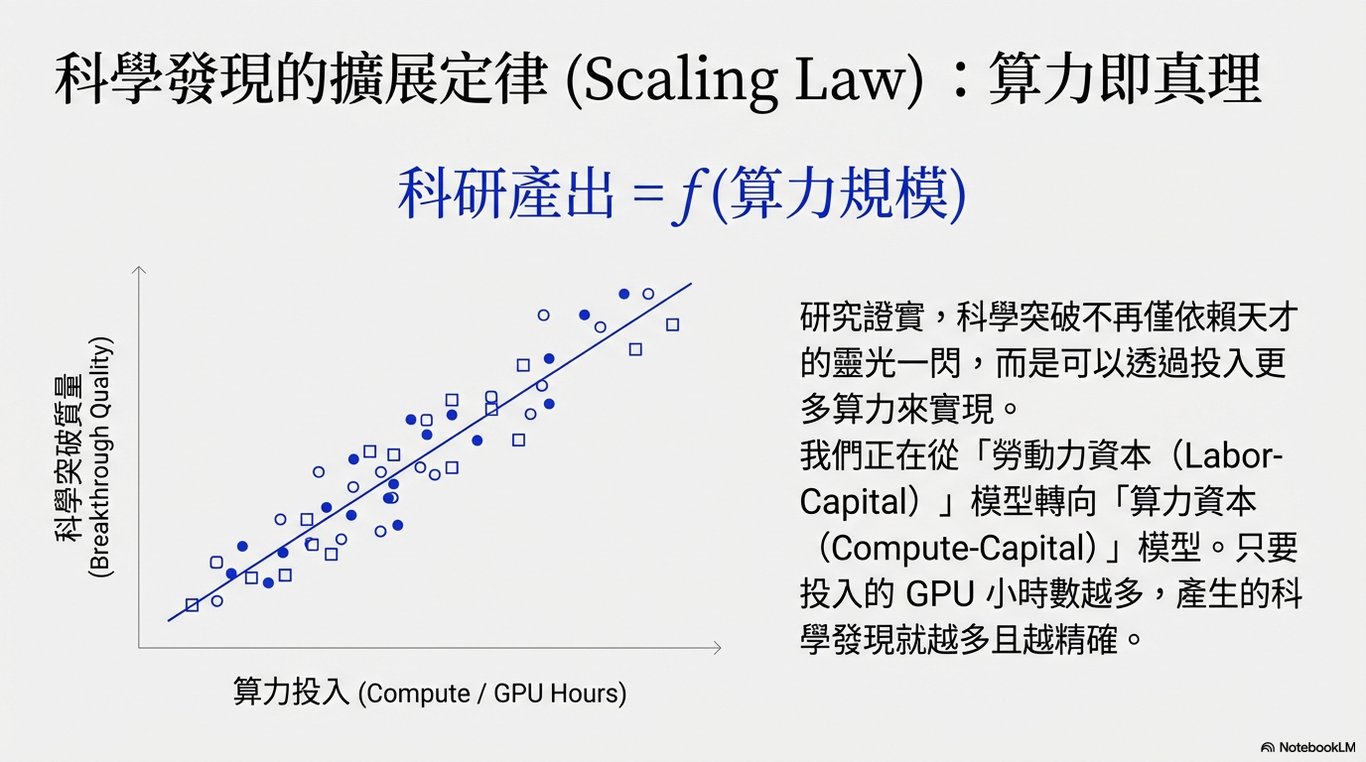 確立科學發現的「擴展定律(Scaling Law)」: 研究者希望證明,科學發現的突破可以透過投入更多的計算資源來實現,而非僅依賴人類專家的專業知識。這將研究進度從受人為限制的過程轉變為可隨計算規模擴展的過程。