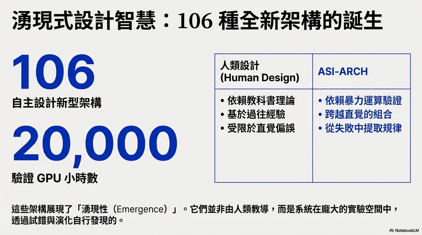超越人類直覺: 研究中提到的 ASI-ARCH 系統自主設計出 106 種新型的網路架構。