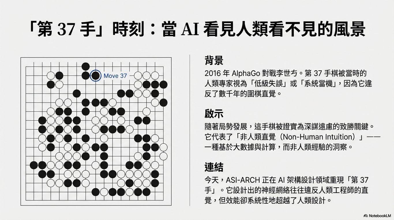 不可見的洞察力: 就像第 37 手在當時的人類棋手眼中是「隱形」的戰略一樣,ASI-ARCH 發現的架構原則,在人類專家的眼中往往是「不可見」且「反直覺」的。