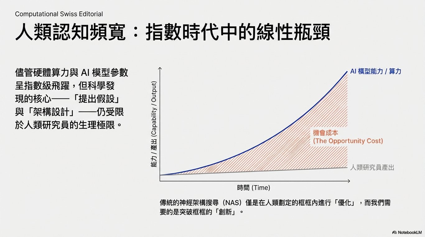 打破人類認知的發展瓶頸: 儘管 AI 系統的能力呈指數級提升,但 AI 研究本身的進展仍受限於人類有限的認知頻寬與研發速度。這項研究旨在實現自動化的科學研究,讓 AI 能夠自主設計出更強大的下一代模型。
