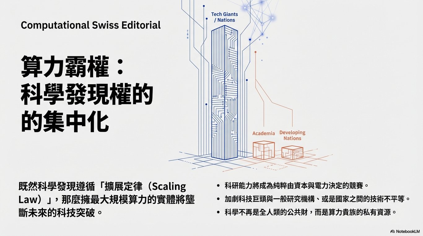 由於科學發現與算力直接掛鉤(Scaling Law for Scientific Discovery),這意味著擁有最強大運算資源的實體(如少數科技巨頭或國家)將能壟斷科學突破的產生。這可能加劇全球的技術不平等,使科研能力成為一種純粹由資本與電力決定的競賽。