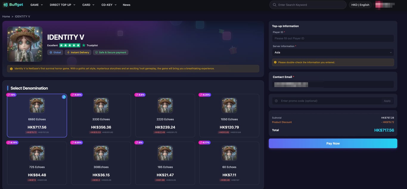 To compete effectively in the 2026 meta, you’ll need to unlock the top meta characters and skins. This requires Echoes, the game’s premium currency. The most cost-effective way to buy Identity V Echoes is to purchase cheap Echoes from buffget, where you can get an 80% discount. The platform is safe, fast, and trusted by players worldwide, with instant delivery and no hidden fees.