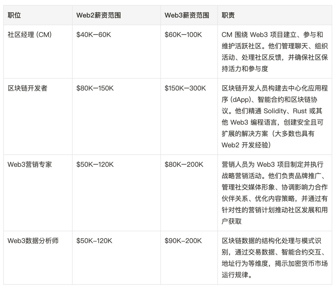与 Web2 相比,Web3 职位的薪资潜力更高。由于需求旺盛且发展空间巨大,Web3 人才的薪资通常比 Web2 类似职位高出 20% 到 100%。