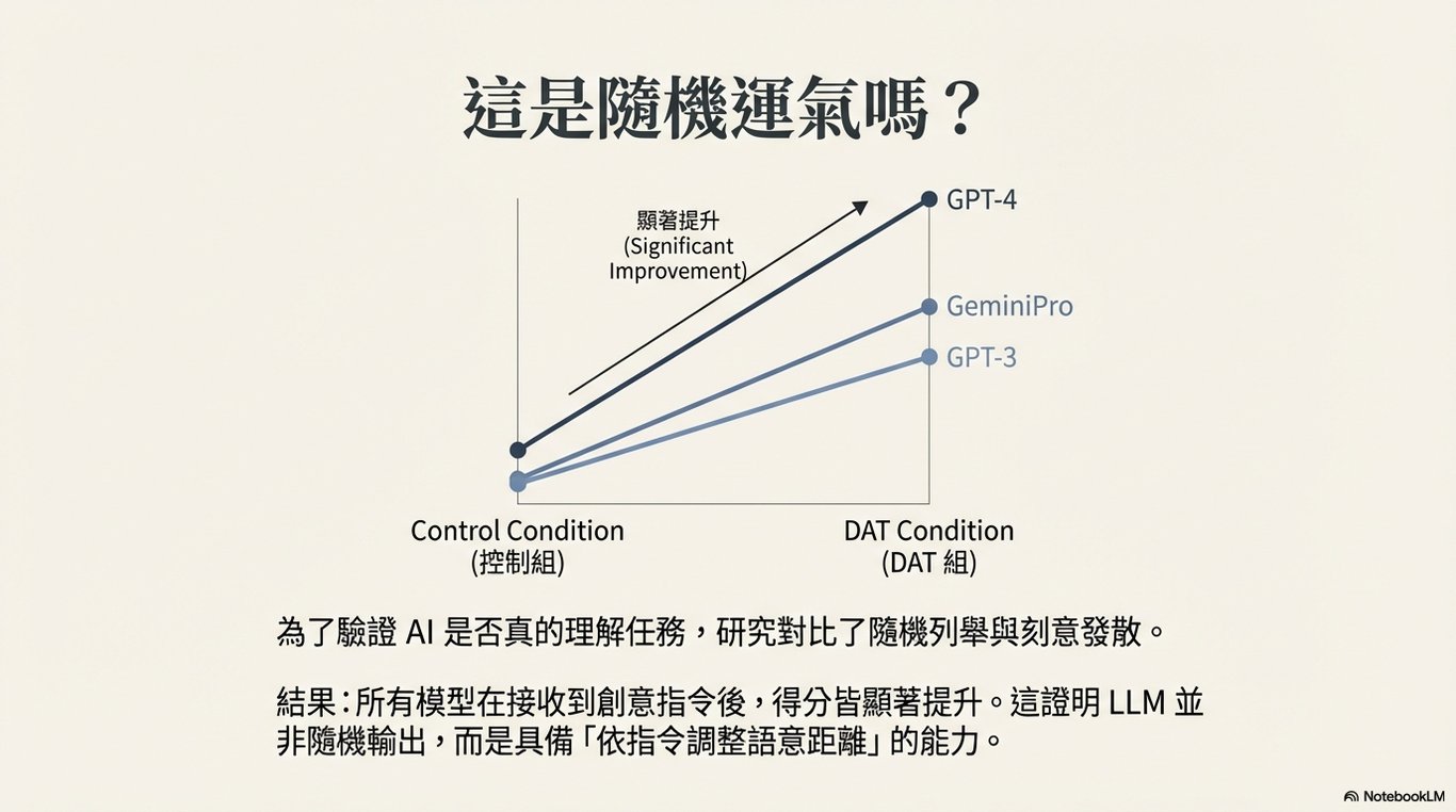 進行基準測試 (Benchmarking): 運用「發散性聯想任務」(Divergent Association Task, DAT)作為客觀指標,對比多個主流 LLM 與一個包含十萬名人類的大規模樣本,在發散性思維上的基礎表現。