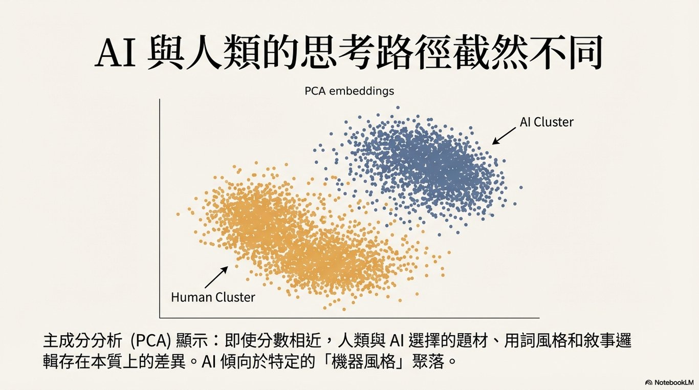 人機差異: LLM 生成的文本與人類寫作的文本,在嵌入空間中形成了明顯區分的群集。這意味著,儘管 LLM 能模仿人類寫作,但其底層的語義結構或風格模式與人類存在系統性差異。