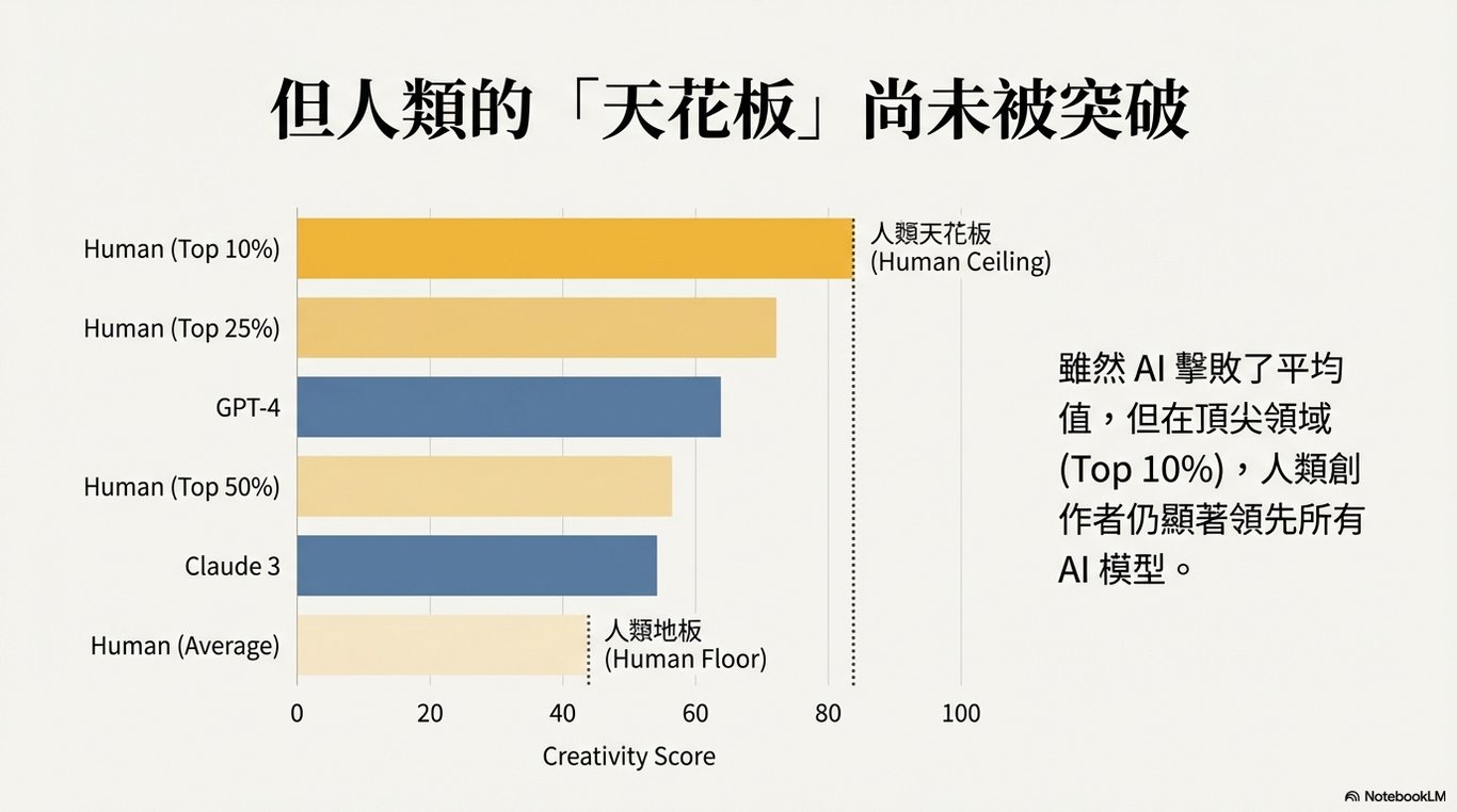 超越平均,但不及頂尖: 最先進的 LLM(如 GPT-4)在發散性思維任務上的表現已能超越普通人類的平均水平。然而,與最具創造力的人類群體(如排名前 10% 的高分者)相比,LLM 仍存在顯著的差距,顯示出一個當前技術未能突破的「創造力天花板」。