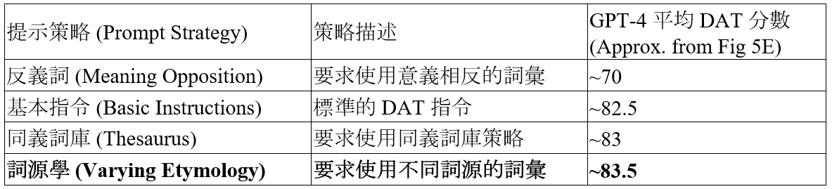 除了調整超參數,透過精心設計的提示(Prompt)也能顯著影響模型的創造力表現。研究比較了四種不同策略對 GPT-4 的影響,結果如下表所示。