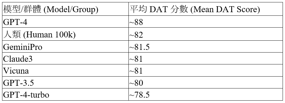在了解了這些評估工具後,下一章節將呈現 LLM 與人類在核心基準測試——DAT 任務上的直接比較結果。
