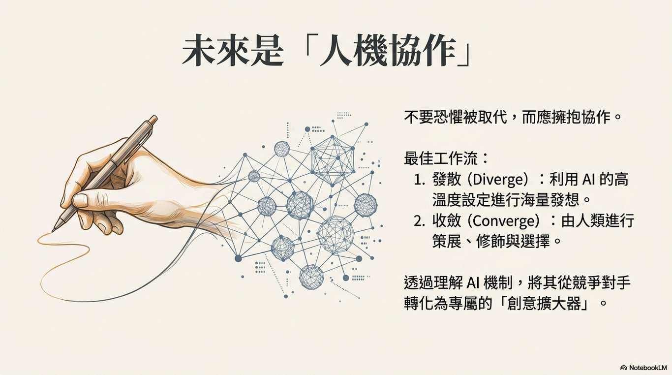 基於此,未來的研究方向應從「競爭」思維轉向「協作」思維。我們應探索如何將 LLM 作為強大的輔助工具,來增強而非取代人類的創造力。透過人機協作,我們不僅能開創新的藝術與科學形式,還能反過來利用這些模型,推動對創造力這一複雜現象本身的計算性理解。