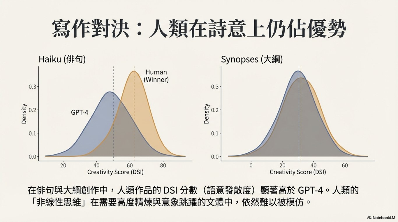 人類在特定任務中仍具優勢: 一個關鍵結論是,在俳句和電影大綱這兩項任務中,人類作者樣本的 DSI 分數顯著優於所有受測的 LLM。需要注意的是,這些人類樣本(來源於電影資料庫與詩歌網站)可能來自經驗豐富的寫作者,與 DAT 的一般人群樣本不同,這可能是導致差異的一個重要因素。