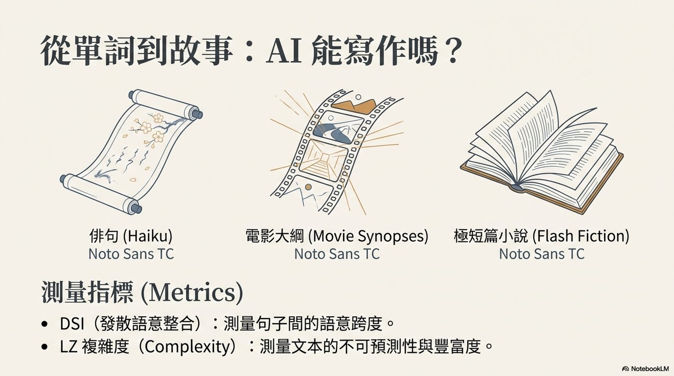 進行泛化能力評估 (Generalization Assessment): 檢驗模型在 DAT 上的高分表現是否能推廣至更複雜的創意寫作任務中,包括俳句、電影故事大綱與閃小說(flash fiction),並將其生成內容與人類寫作語料庫進行比較。