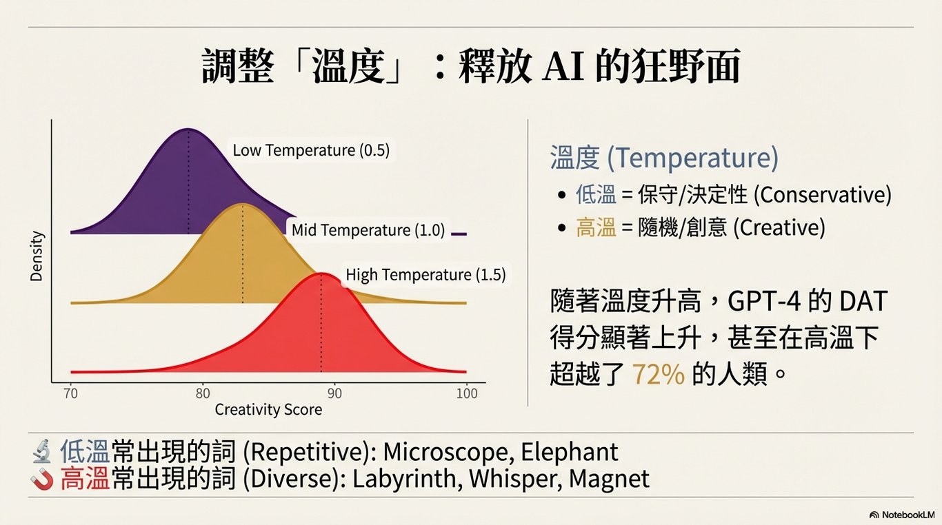 「溫度」(Temperature)是控制 LLM 輸出隨機性的關鍵超參數。以表現最佳的 GPT-4 為例,研究結果顯示,其 DAT 分數隨著溫度值的升高而顯著提升。