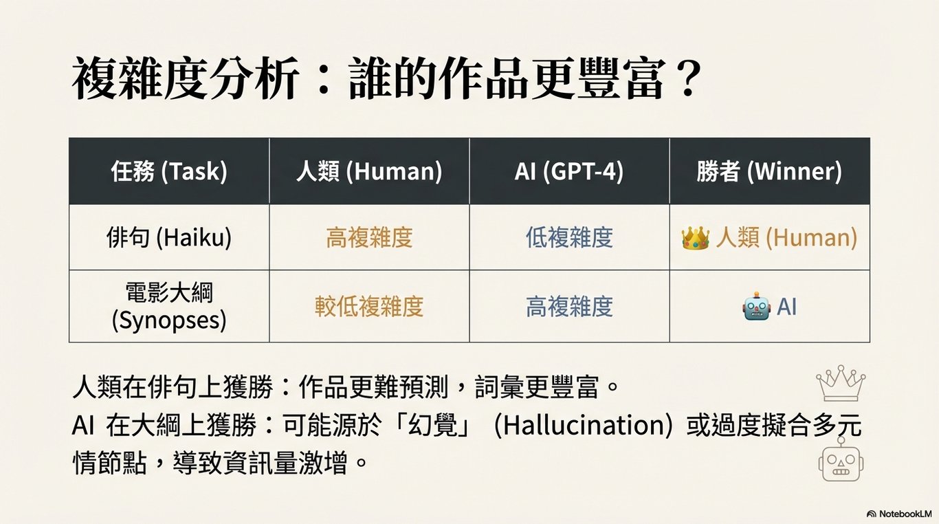 核心結論是,雖然 LLM 在模仿和生成看似具有創造力的內容方面取得了驚人的進展,甚至在某些指標上超越了普通人類,但人類的頂尖創造力,特別是那些位於金字塔頂端的表現,仍然是獨特且難以企及的。