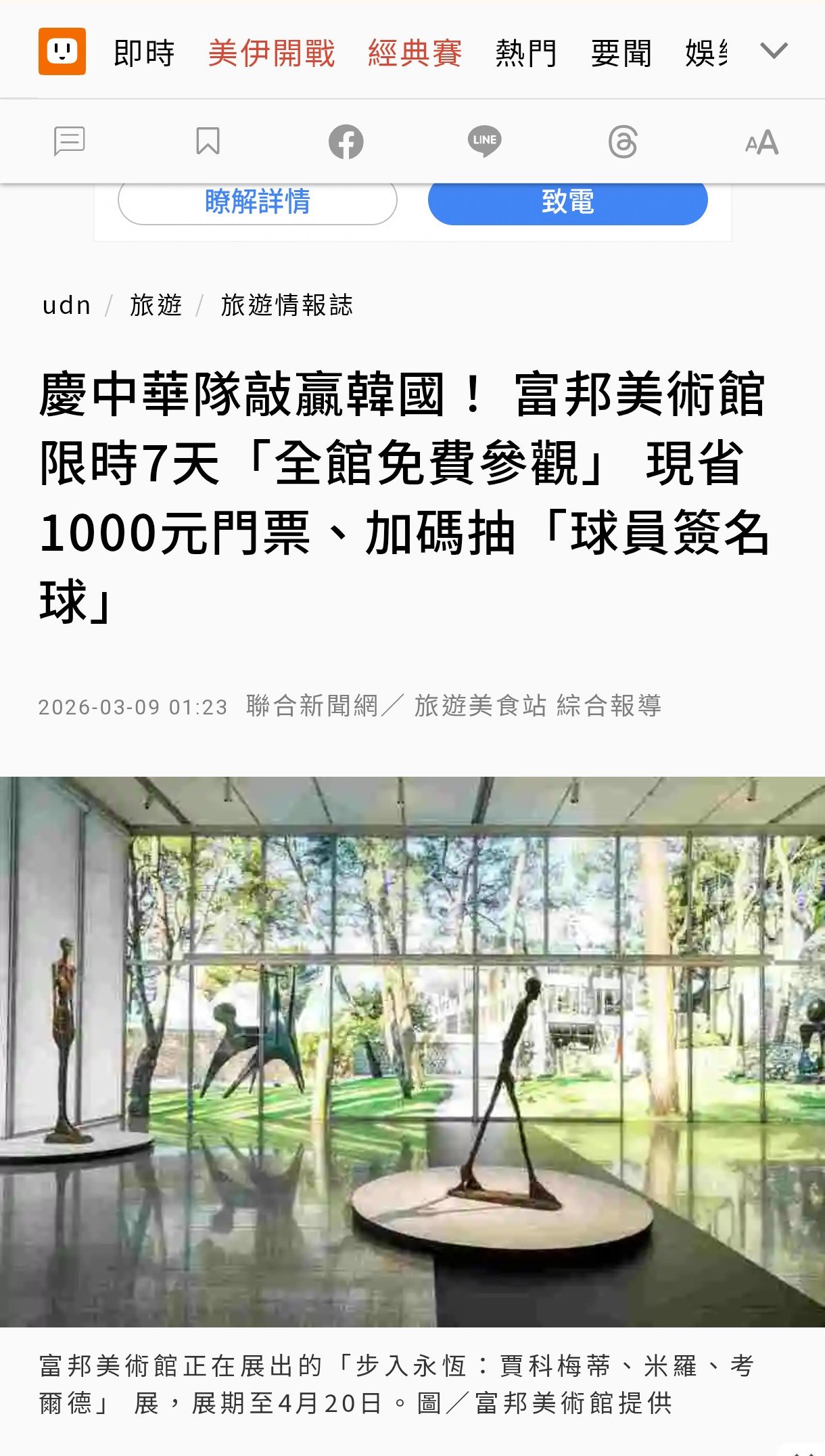中華隊在本屆 WBC 中,好不容易擊敗韓國隊,台灣社會頓時陷入一片歡騰的氛圍之中。 忽然收到 @VietJoe333 寄給我一個連結,是有關於為了慶祝中華隊難得的勝利,【富邦美術館】決定自3月9日起至3月15日止,連續一週推「全館免費參觀」活動。