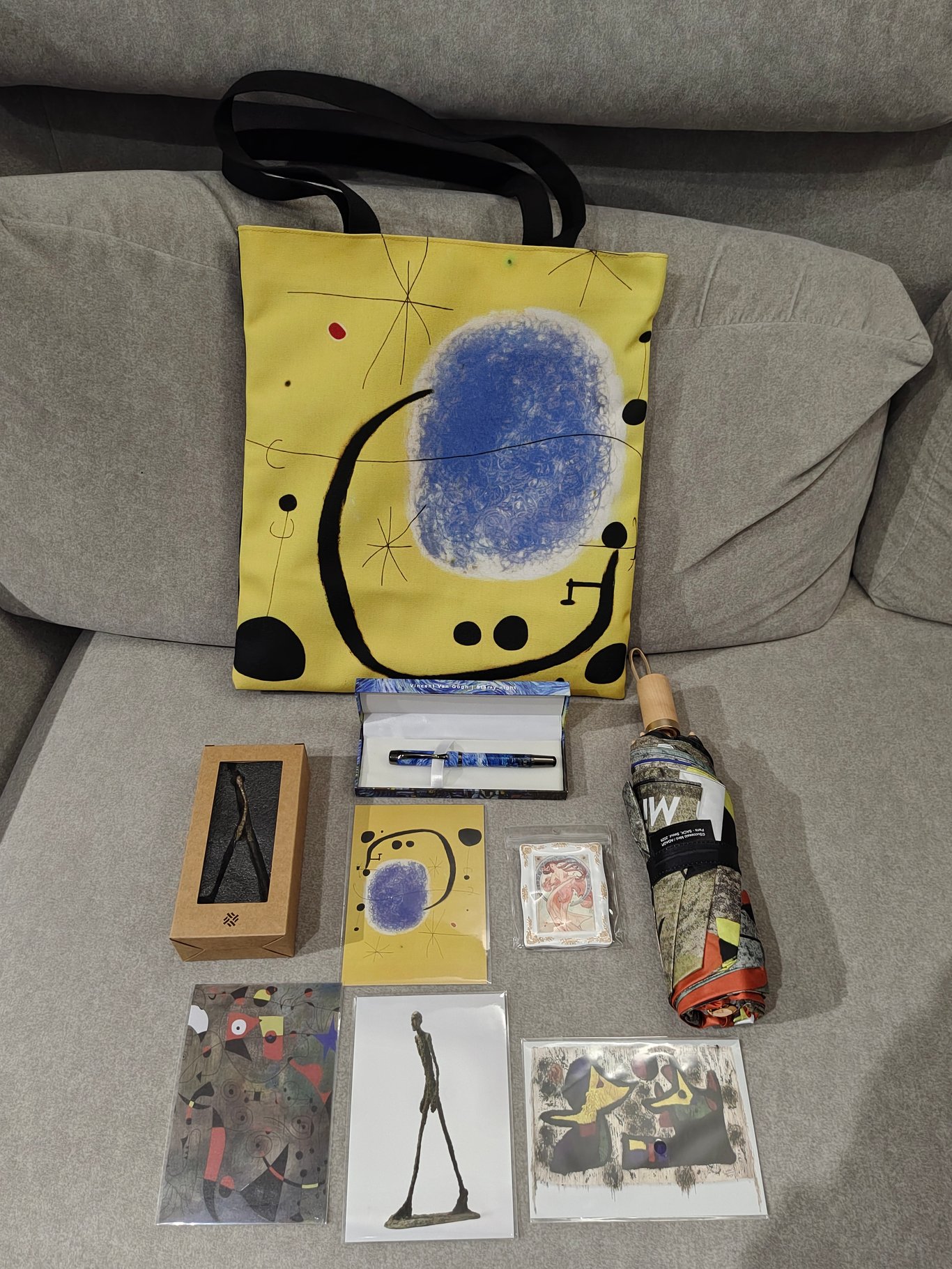 看到大家都瘋狂採購,我們也不能免俗地買了一個大福袋 (990元),是米羅油畫的購物袋,裡面有一隻米羅畫作的傘, 一個 walking man 的立體冰箱貼,還有四張明信片。我還另外買了《Starry night》原子筆和一個《慕夏》的小冰箱貼。