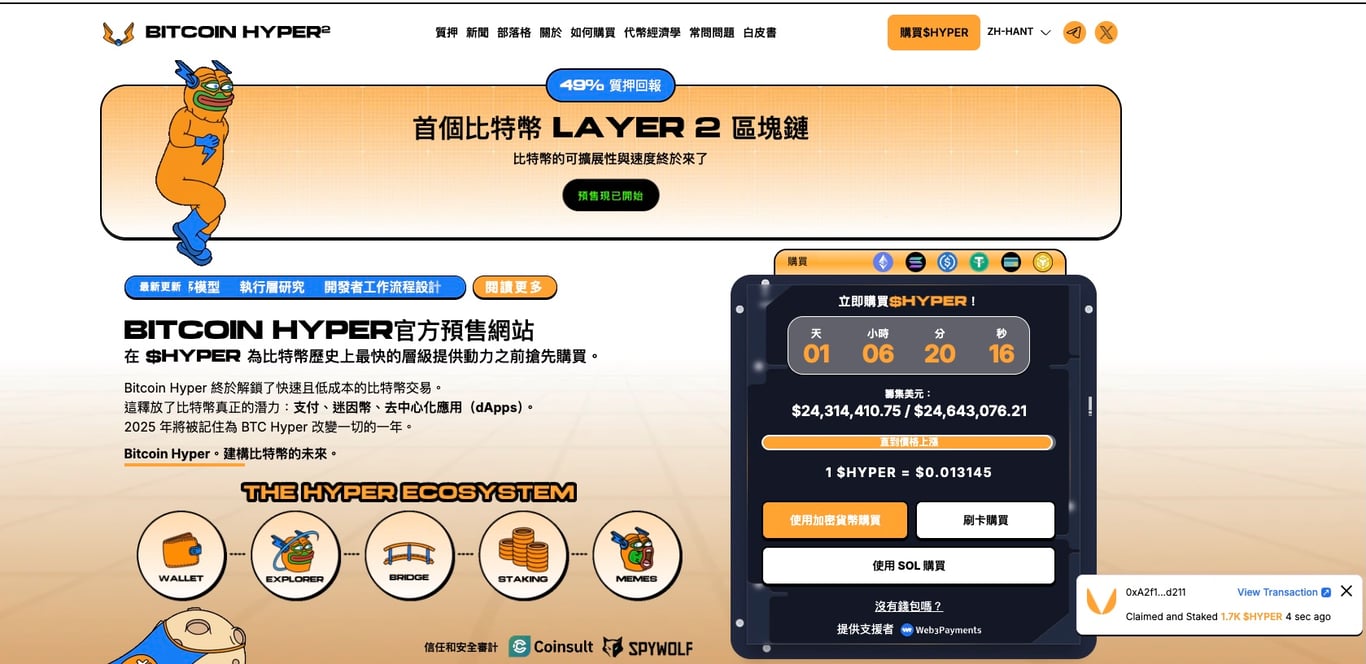 AI報告中特別指出,新興專案Bitcoin Hyper(HYPER)是最具顛覆性的技術創新之一。它採用Solana虛擬機器(SVM)架構,建構首個比特幣Layer 2網絡,能處理每秒高達65,000筆交易,並將手續費降至極低水準,同時維持比特幣主鏈的安全性。這項突破讓DeFi、NFT與去中心化應用首次能在比特幣生態中高效運作。