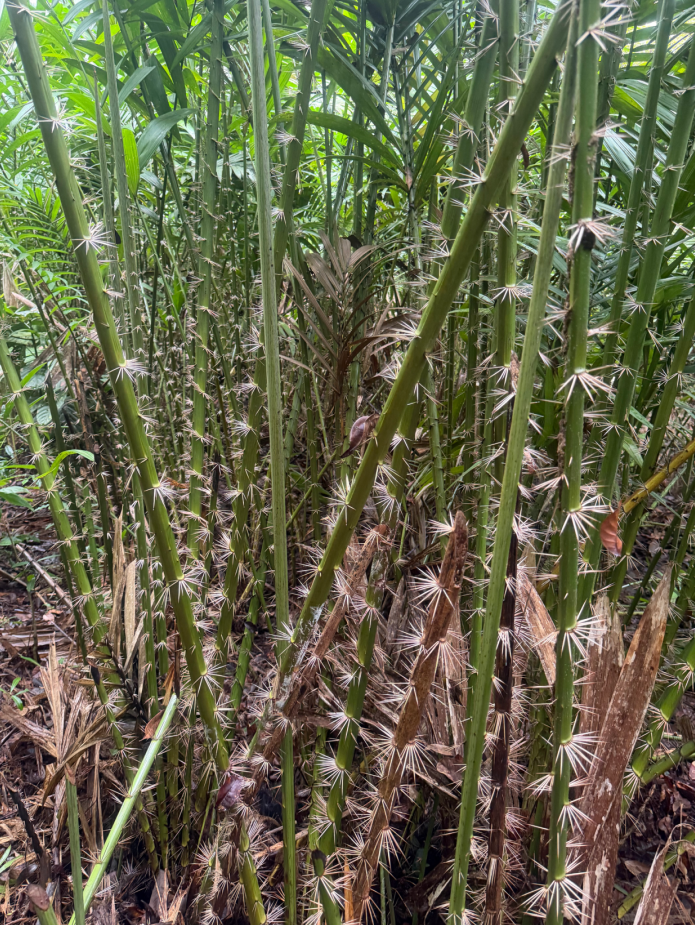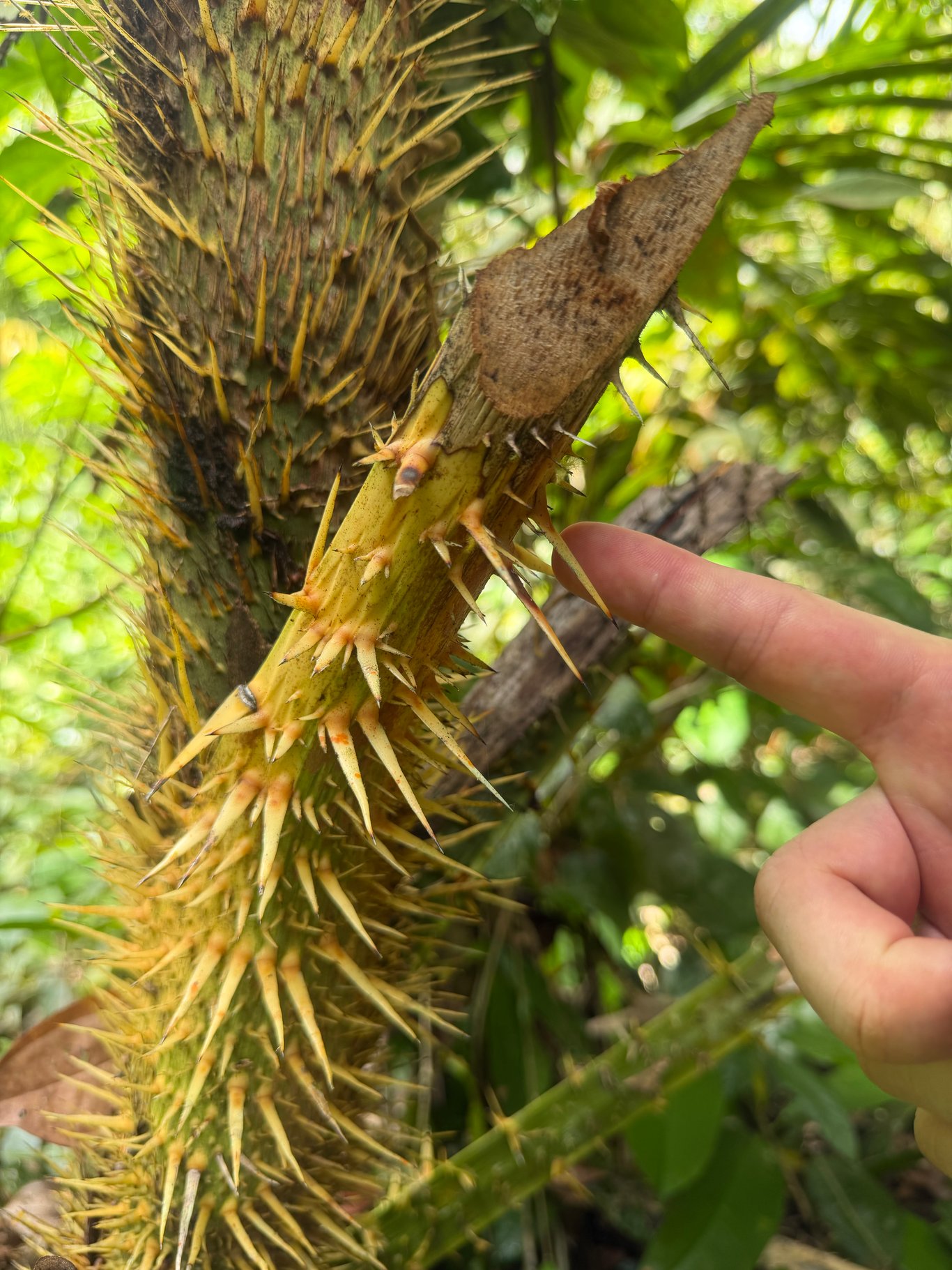 在 Bako 国家公园徒步的时候,我进入了一片热带森林。阳光从树冠缝隙中落下来,空气潮湿而闷热,脚下的路并不平整。我跟着向导往前走,看见各种我叫不上名字的植物。它们并不“好看”,也不友善,甚至带着明显的警告意味。有的植物满身尖刺,靠近时身体会本能地停下;有的树会定期剥落树皮,露出一段红色的躯干,颜色浓烈而突兀。向导指着其中一种说,它很 greedy,不让其他植物攀附向上,会把空间完全留给自己。