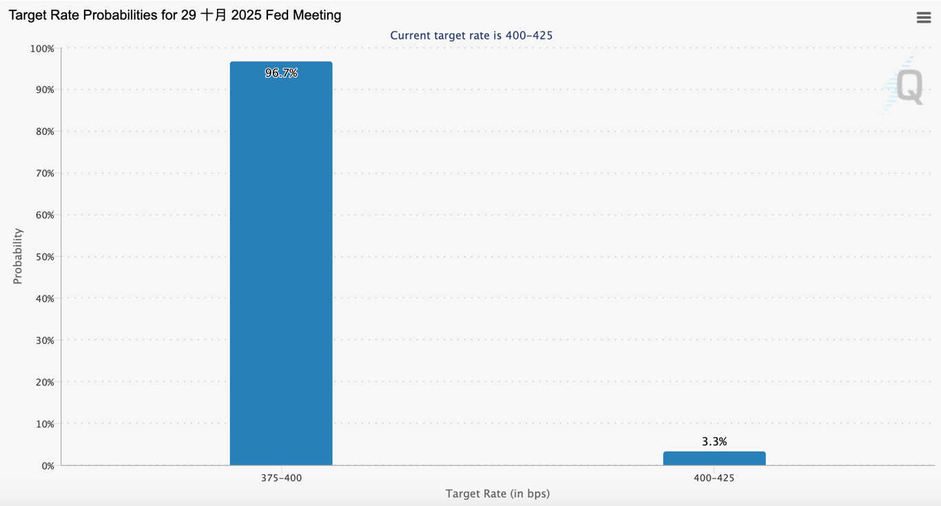 市場普遍預計,聯準會將在 10 月的利率決議會議上將降息 25 個基點,降息預測機率高達99.4!