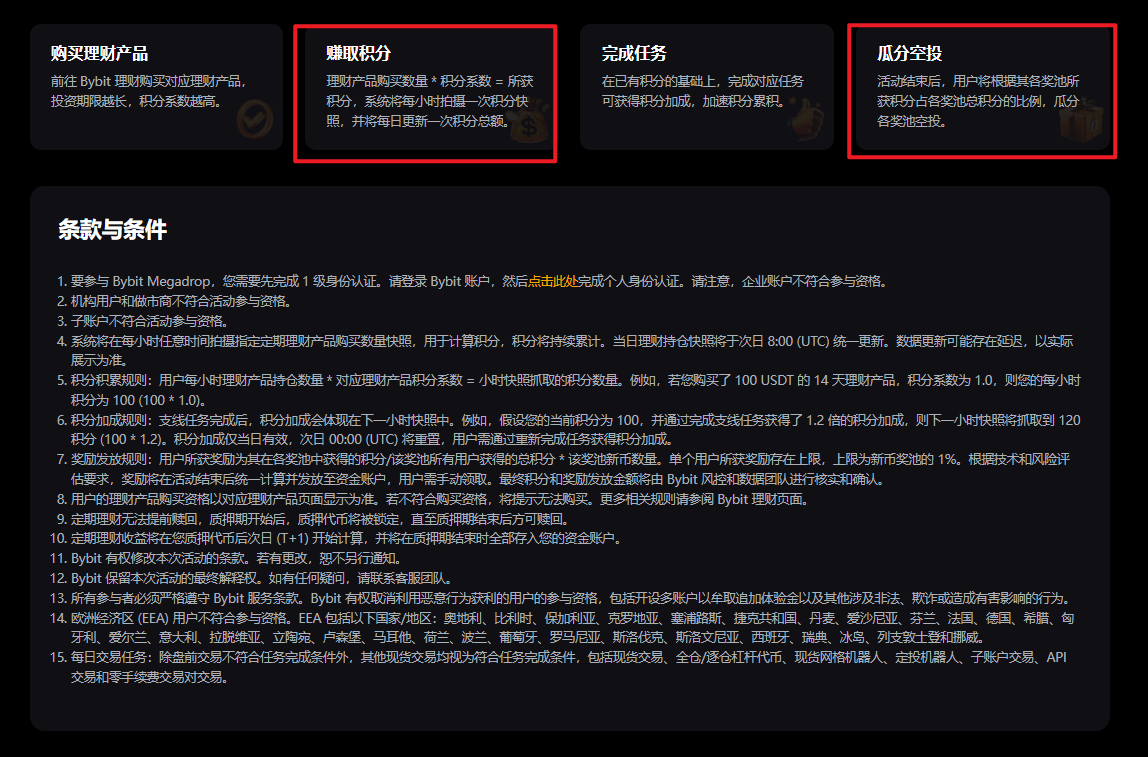 Megadrop 是Bybit推出的全新代币发射平台,作为当前热门的Web3空投渠道之一。其核心机制是将定期理财与空投相结合,用户无需交易,只需锁定理财产品即可累积积分并参与代币分配。操作简单无风险,适合稳健型投资者。