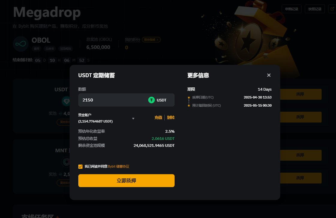 实际上,参与交易所活动往往更可靠。目前Bybit的Megadrop活动刚启动,早质押早累积积分,积分越多空投越多,同时定期理财产品提供APR收益,实现双重获利。Bybit Megadrop兼顾散户、稳健投资者和大资金用户,质押理财即可积累积分,既获稳定收益又得项目空投,操作简便回报明确,早参与优势显著。OBOL空投已启动,未来将持续上线新项目,持续参与可获取新机会。
