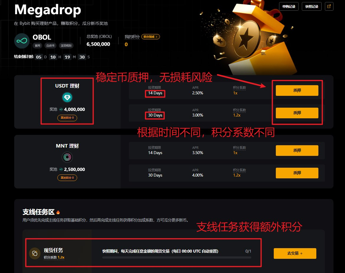 然而,其他交易所如Bybit不甘示弱,推出全新代币发射平台Megadrop,首期空投项目$OBOL已上线,用户可瓜分650万枚代币。活动时间有限,参与门槛低,只需质押USDT或Mantle的定期理财产品,系统自动进行积分快照,在享受理财收益的同时实现“零成本打新”,首期活动收益可观。