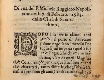 尊敬的视察员神父,正如之前您高兴地所知道的,因着天主的慈善,中华帝国的大门再次打开,我们可以进入这个帝国。新的都堂派人来叫我:他听说我们这些人来自罗马,由伟大的父亲,也就是至高的司祭所派遣,并且我们渴望学习他们的语言和文字,以便我们可以与他们交流我们的东西,他非常热情地接待了我,让我可以选择城市中最好的地方来为我及同伴们建造房屋,以及一座用于做弥撒的小教堂。此外,他也允许我教导一些中国人,一开始他还借给我一百两银子,这笔钱相对于这里物资的丰富程度来说,并不是微不足道的。有了他的以及其他人的帮助,我们建造了一座小房子,利玛窦神父和我以及一些帮助我们做翻译的人现在都住在那里。