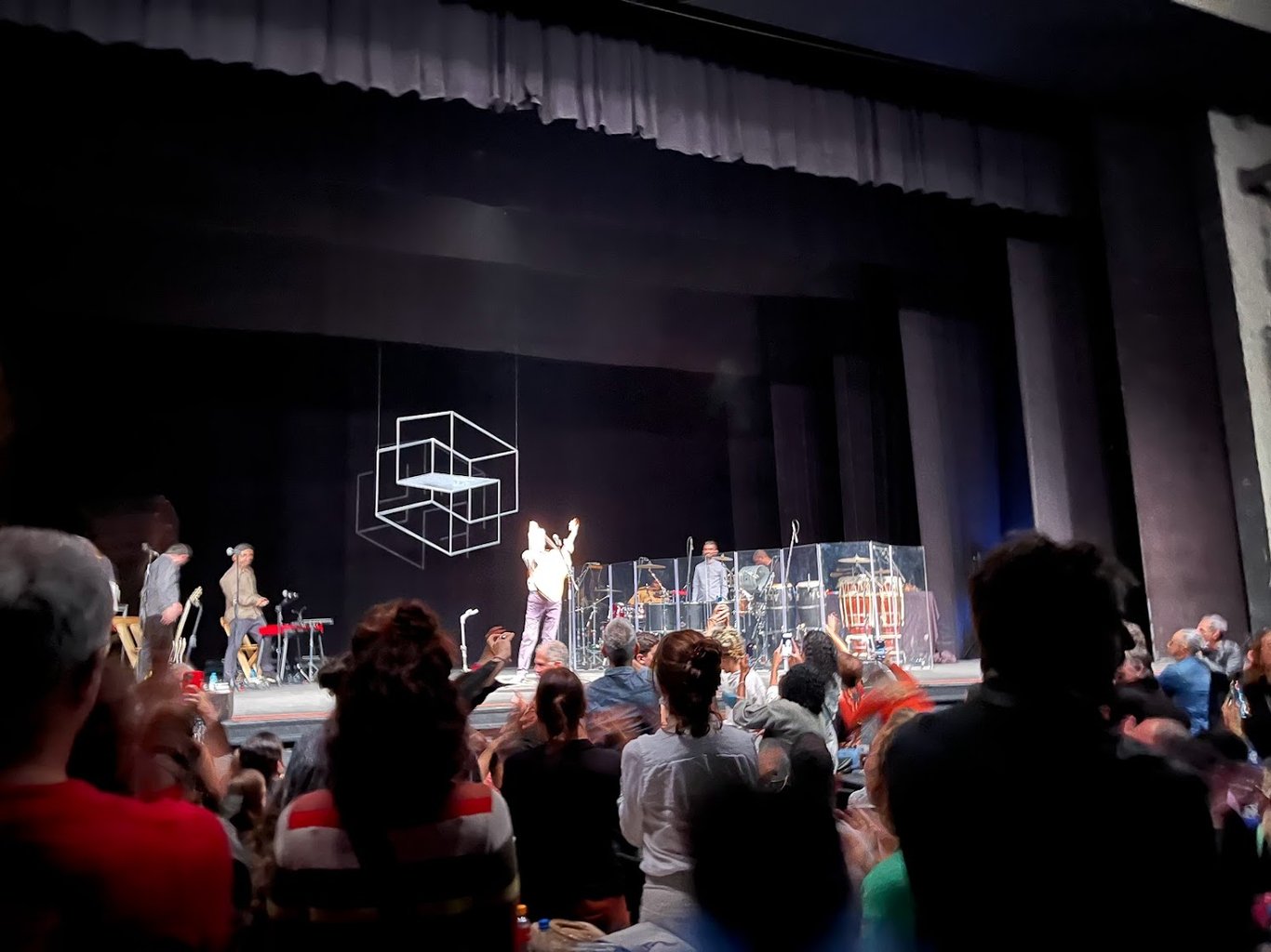 然而坐在那狹小局促的、畢竟有點遙遠的座位上,自己也常常略覺迷茫,不知眼睛應該看向何方——大螢幕?舞臺中央? 新朋友柏林那篷鬈髮,橫在我與舞臺之間,擋住卡耶塔諾的下半身,除了他靠近其他樂手或即興跳桑巴的時候。