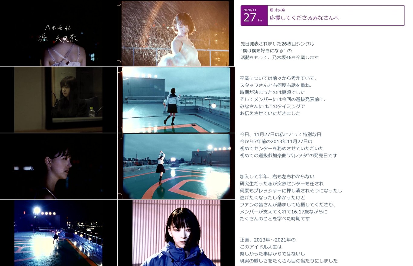 於官方Youtube頻道公開了堀首支獨唱曲「冷たい水の中」(在冷水中)的MV,堀本人在MV中宣告即將從團隊畢業。一直被視為次世代王牌的堀竟在這個關鍵時期宣告畢業,引起極大迴響,對於選擇畢業的原因,坊間出現多種猜測,而本人並未特別作出回應。其後堀於網誌向支持者交代畢業時表示,早在夏天時已與營運商討並作出畢業決定,特意選在這天宣佈是為了紀念七年前的今日,自己初次成為Center的單曲「バレッタ」發行。回顧過去七年間的點滴,有美好的,也有殘酷和痛苦的,在空降時多次幾乎被壓垮,幸得成員和支持者的幫助和鼓勵,才能走到今天,並從中學會了很多,得到了保護別人的能力,也學會珍惜支持自己的人。自己的青春屬於乃木坂46,經歷的情感、看到的景色、相遇的人,使她深感幸運,當中充滿了對成員和支持者的感激。日後打算成為一個能為別人帶來一些東西的人,並嘗試成為一名演員。