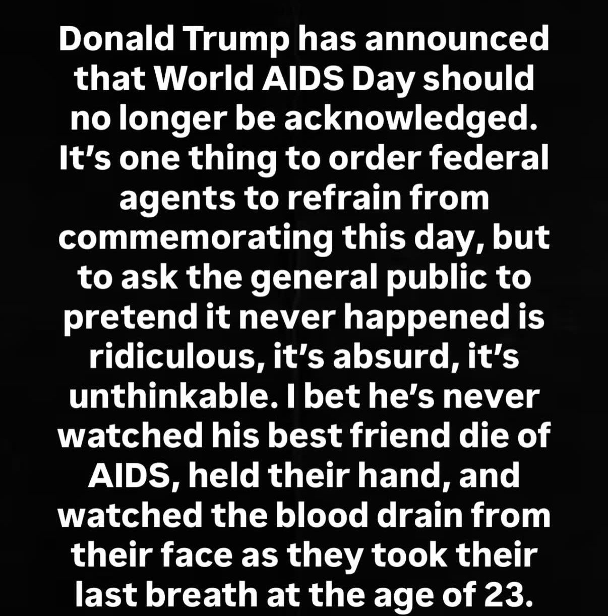 所以当特朗普政府宣布不再纪念国际艾滋日,她的愤怒不是“政治立场”,而是侮辱。她写道: