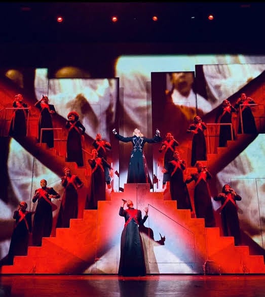 舞台是巨大的红色阶梯,背景像燃烧的教堂,几十个身影穿着黑袍,围成一个巨大的十字结构。她站在阶梯最高处,灯光在她的脸上投下一层不规则的阴影。