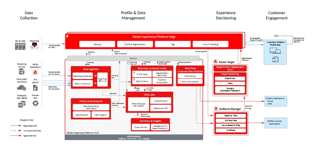 Adobe Experience Platform 作為整體基礎,從網站、CRM、App 與離線交易等各接觸點收集資料,並標準化為 Experience Data Model (XDM)。所有資料儲存在統一的 Data Lake 中,再整合成即時的 Customer Profiles,讓品牌能隨時掌握每位客戶的最新動態。