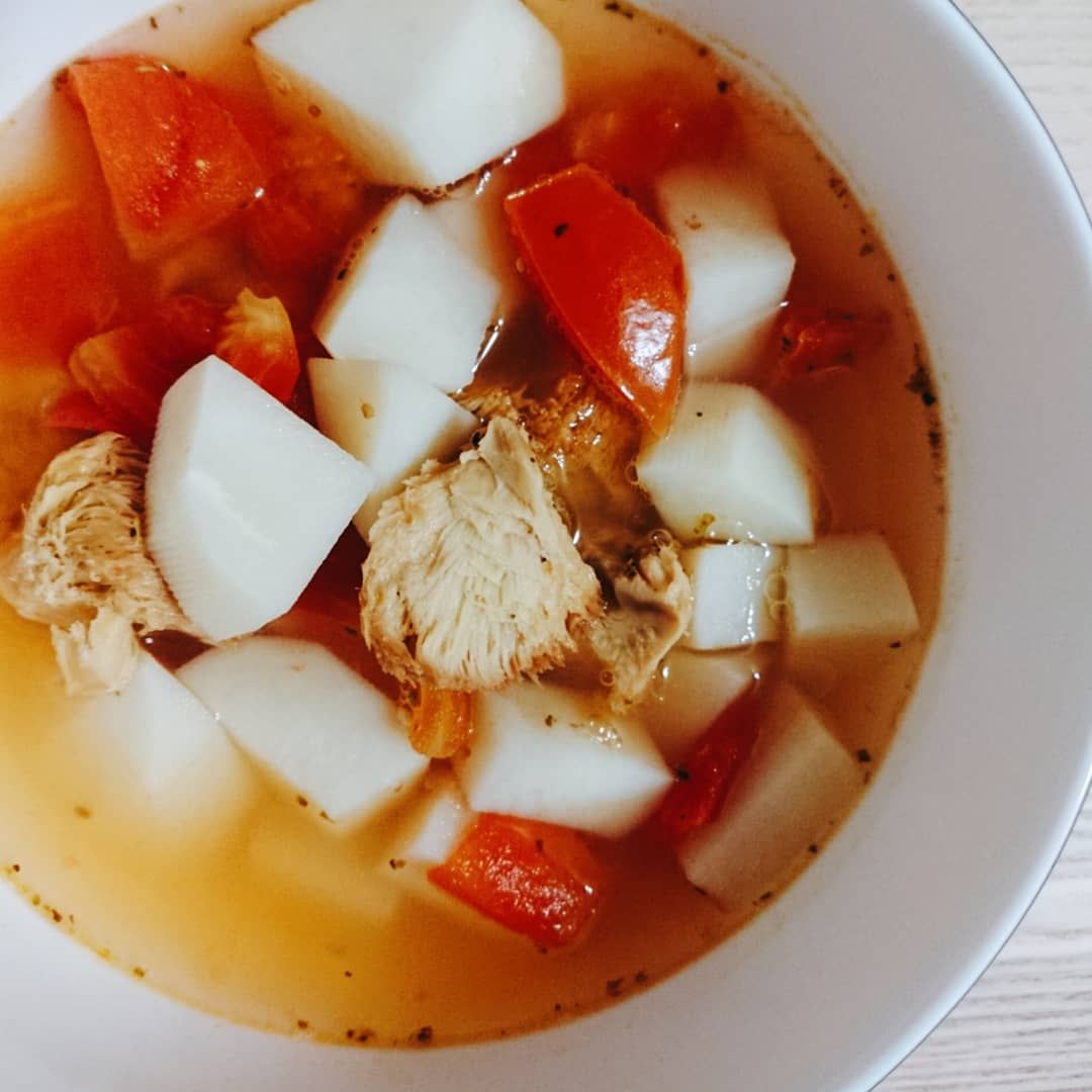 葷食有一道啤酒雞料理,素食用猴頭菇替代,我用的是零酒精海尼根燉煮馬鈴薯跟番茄、猴菇,加點鹽、糖,最後撒上義式香料,煮鬆軟的馬鈴薯好好吃😋