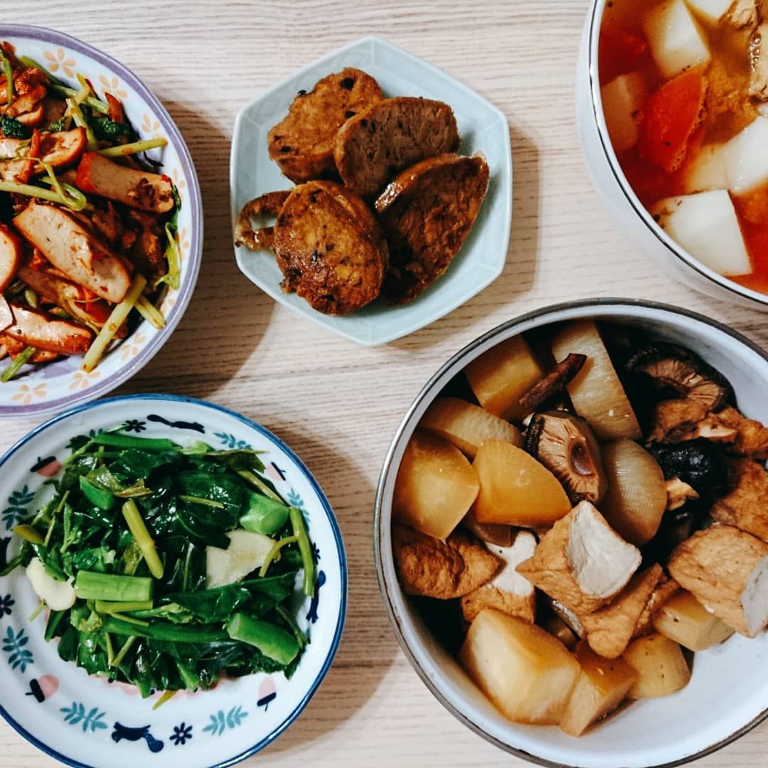 晚餐有滷蘿蔔豆腐、辣炒豆干、素魚、芥藍菜搭配義式猴菇湯,滿足☺
