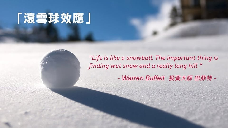投資就像滾雪球,雪球的大小取決於三個因素:最初的雪球大小(本金)、雪球滾動的時間長度(投資期間)以及雪球滾動的雪地斜度(年化收益率)。只要你有足夠的時間,並選對了雪地(市場),雪球自然會越滾越大。