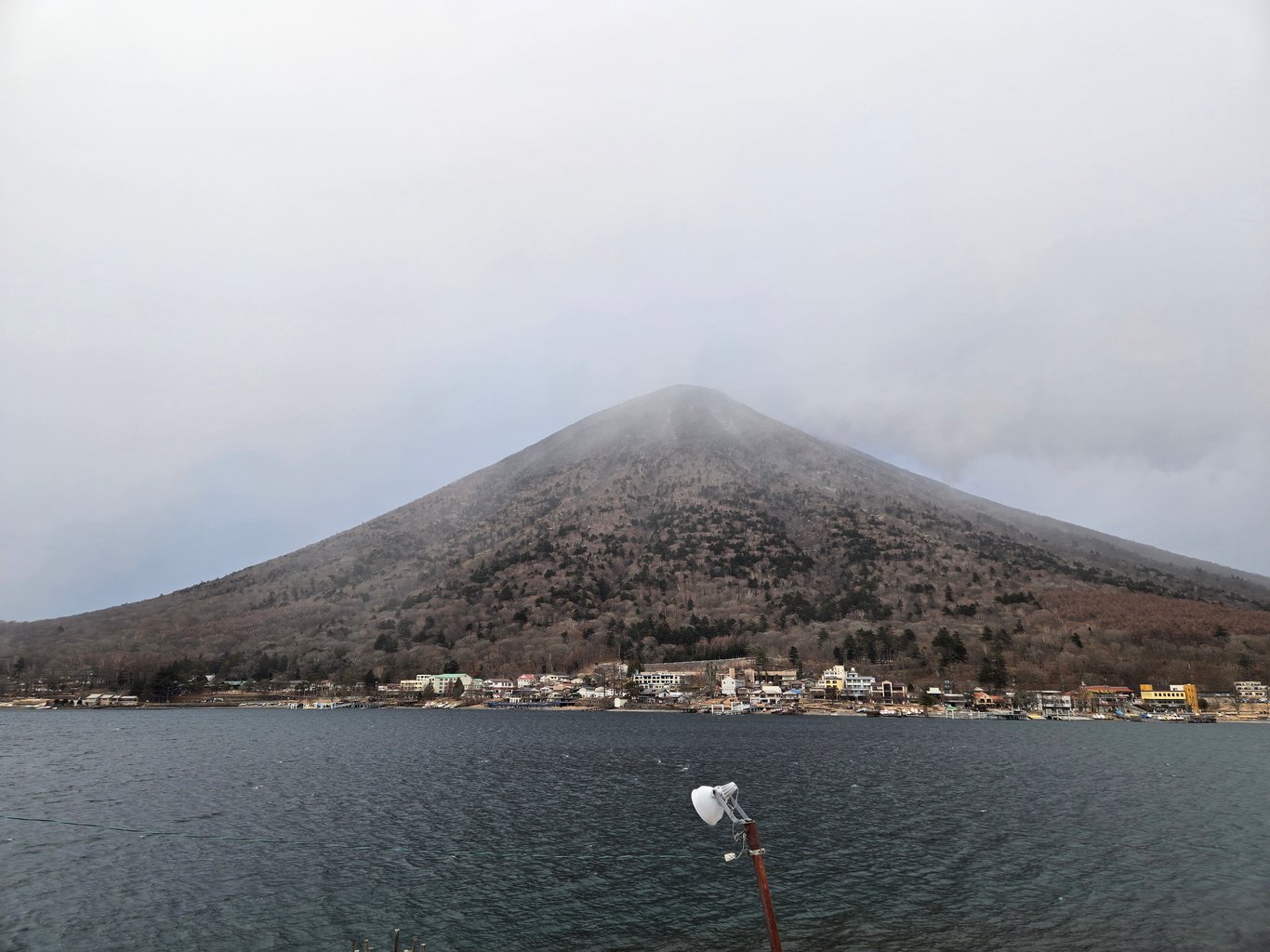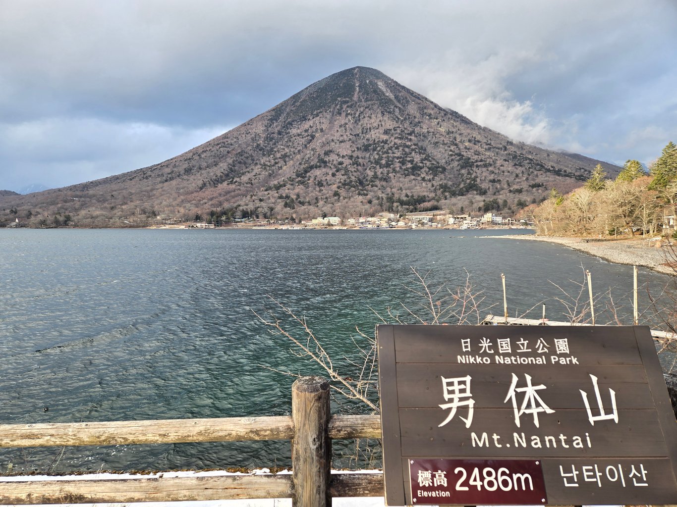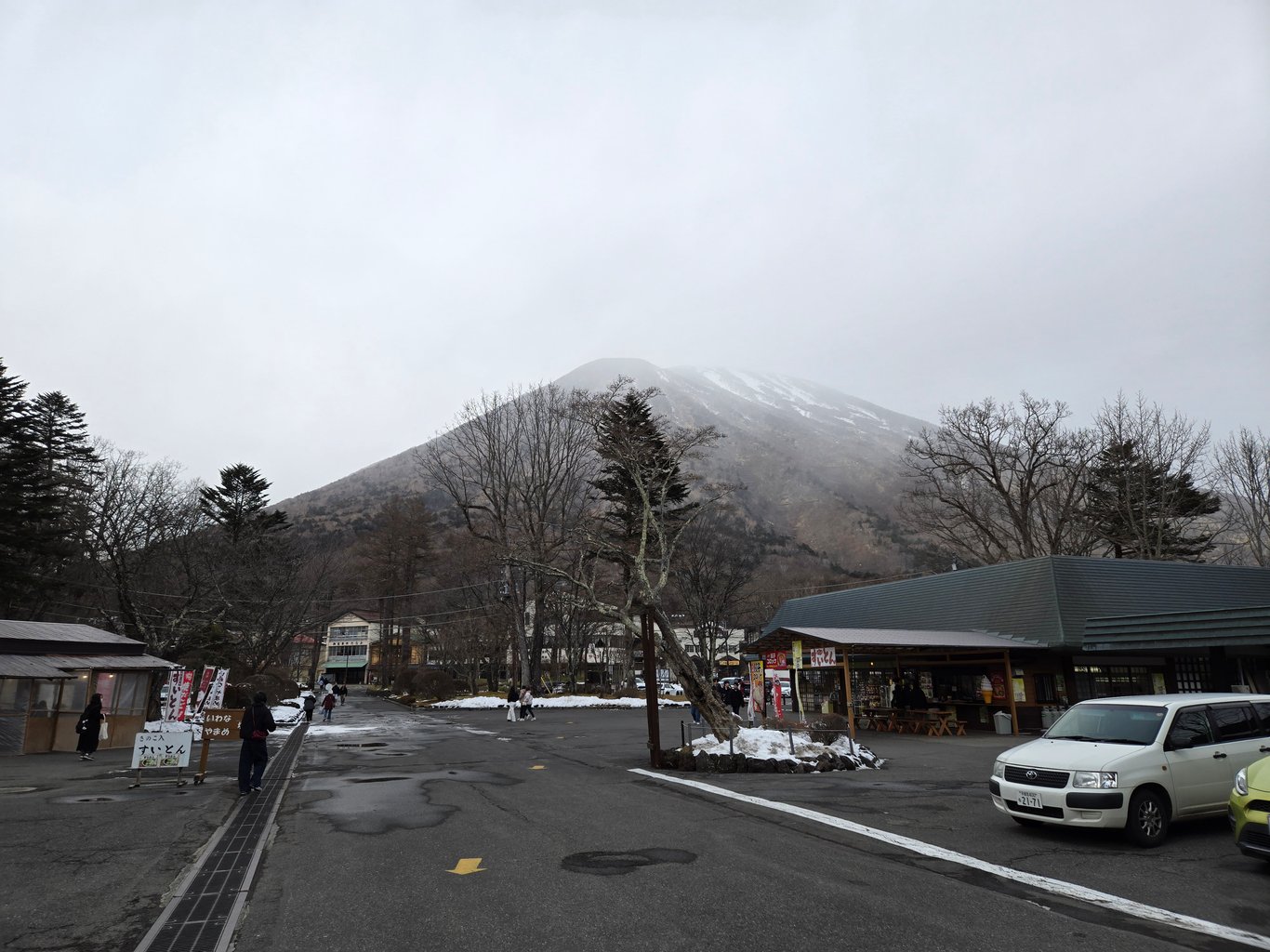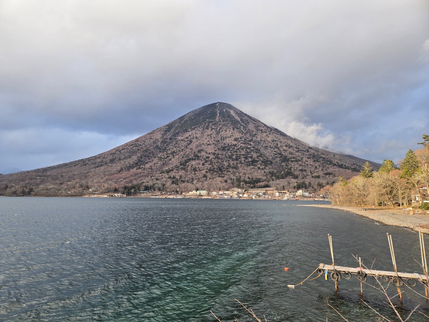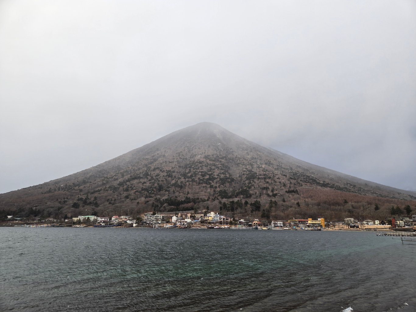 在教堂对面坐上了公汽,前往中禅寺湖。车走了很长的路,一路上不断地转弯,摇摇晃晃,我看着外面积雪的山谷,我才意识到,中禅寺湖是在高海拔的山里,离日光寺社的距离比纸面上远很多。自然交通费也是令人咋舌,单程1200多日元。到了中禅寺湖,空气更加纯净,路边到处都是残雪,点缀了残雪的男体山就矗立在城区里,让我想家了,想起了家里的大黑山。我查看了时间表,发现战场原出发回来的车最晚一班在四点,时间上肯定是不行了,就准备一下午都在中禅寺湖。如此也是不着急,就吃了个午饭。中禅寺湖这边的商业服务倒是不少,不过我才知道,日光本地的特产是薄豆皮,日语叫汤叶的东西。倒不难吃,但没什么价值,就和日本其他旅游特产一样。