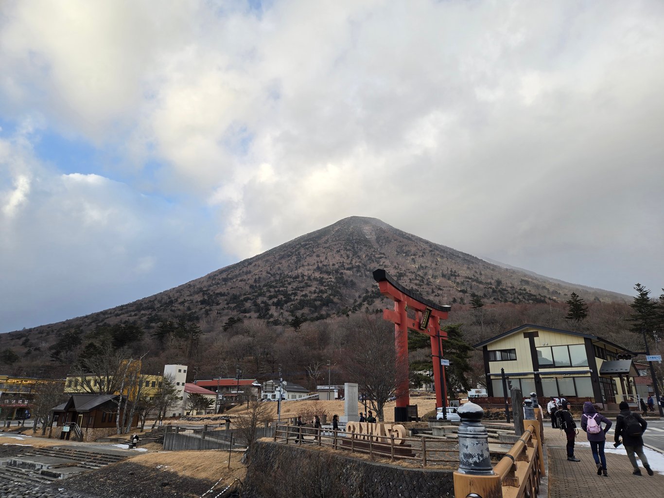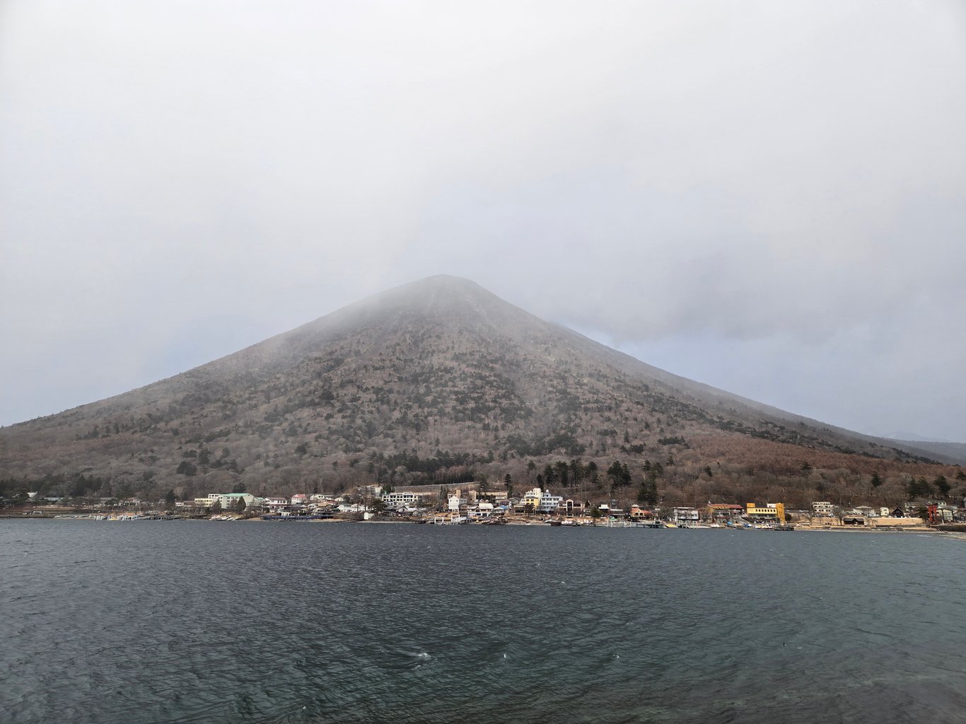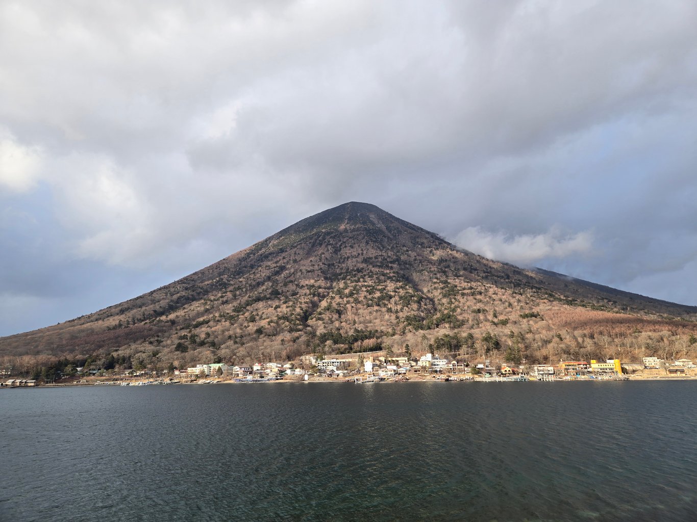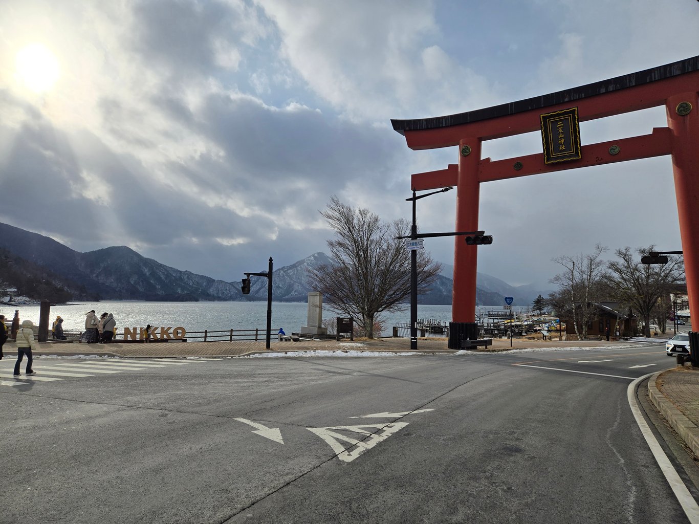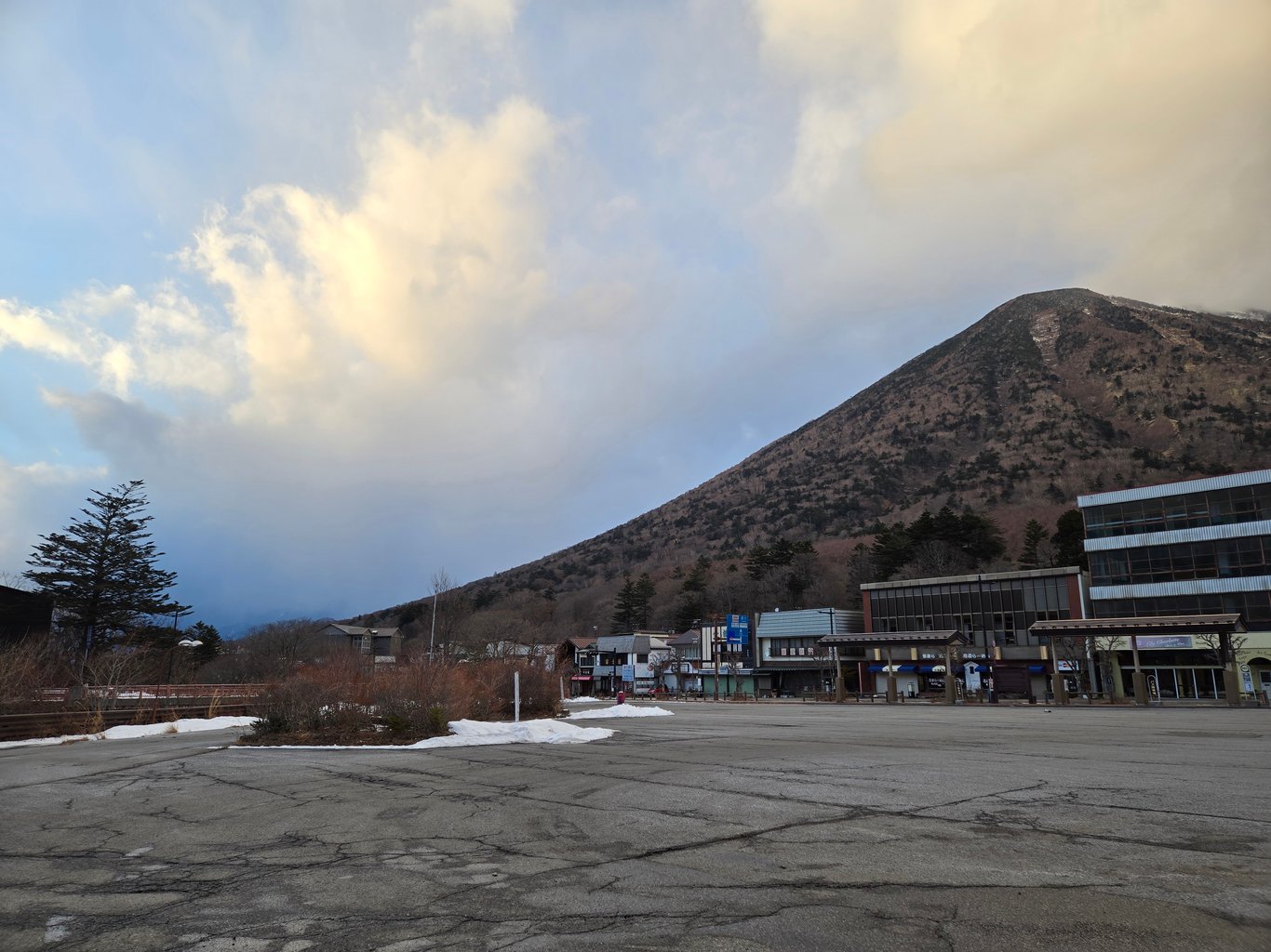 在教堂对面坐上了公汽,前往中禅寺湖。车走了很长的路,一路上不断地转弯,摇摇晃晃,我看着外面积雪的山谷,我才意识到,中禅寺湖是在高海拔的山里,离日光寺社的距离比纸面上远很多。自然交通费也是令人咋舌,单程1200多日元。到了中禅寺湖,空气更加纯净,路边到处都是残雪,点缀了残雪的男体山就矗立在城区里,让我想家了,想起了家里的大黑山。我查看了时间表,发现战场原出发回来的车最晚一班在四点,时间上肯定是不行了,就准备一下午都在中禅寺湖。如此也是不着急,就吃了个午饭。中禅寺湖这边的商业服务倒是不少,不过我才知道,日光本地的特产是薄豆皮,日语叫汤叶的东西。倒不难吃,但没什么价值,就和日本其他旅游特产一样。