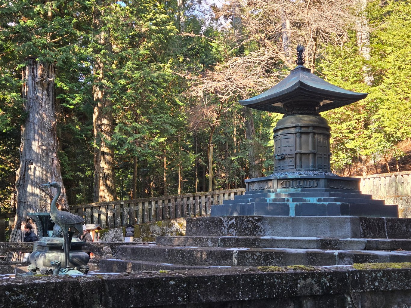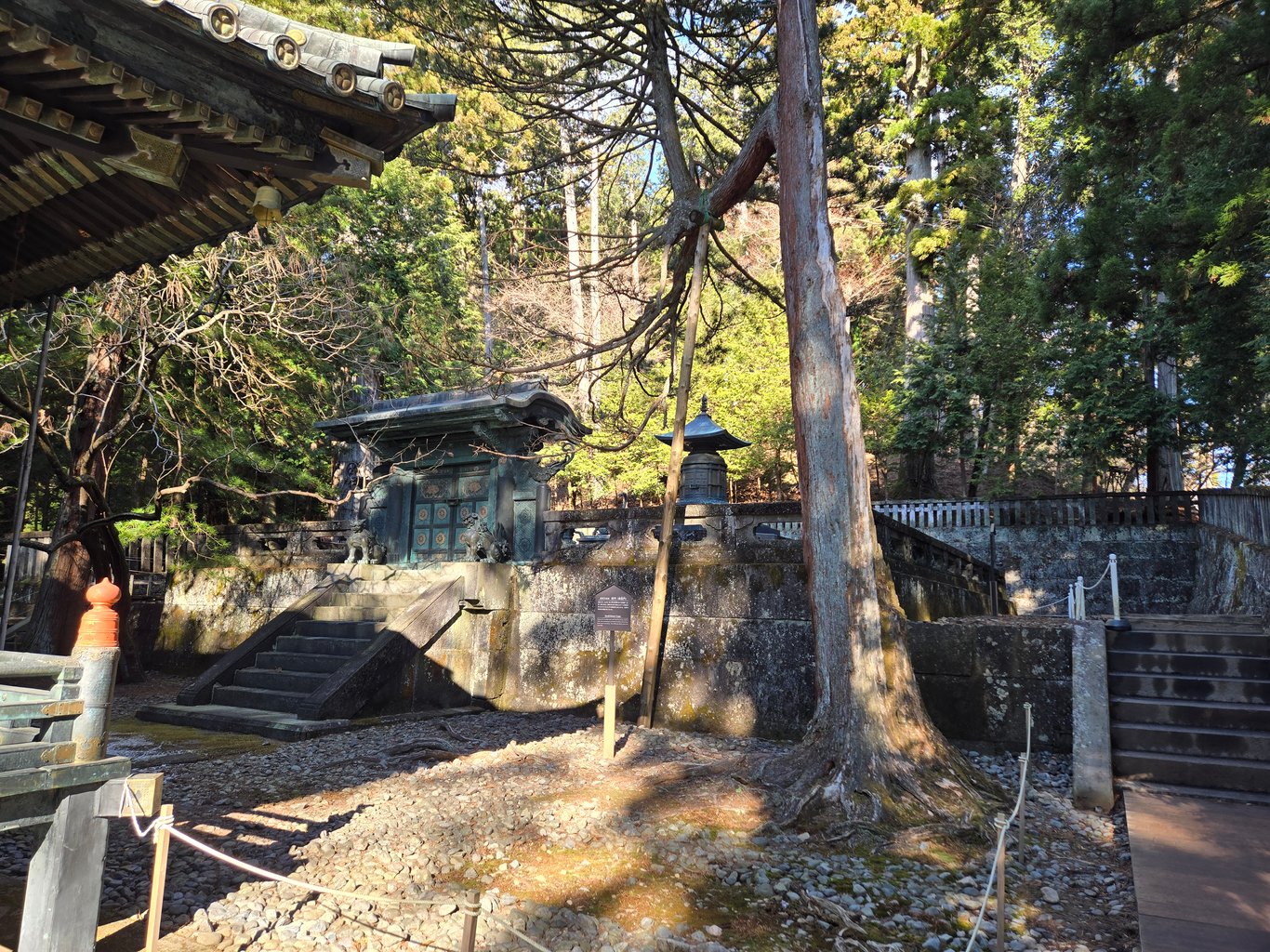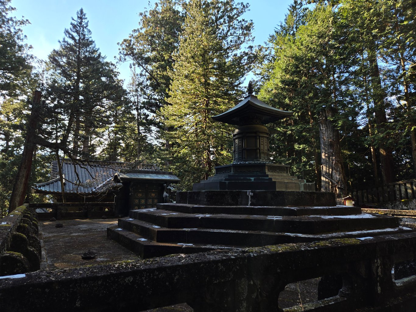 主殿附近遛完了,下一步就是去奥宫。在通往奥宫的山门前,我看到了梁上的睡觉小猫,这是日光东照宫最受欢迎的雕塑。不过著名的三只猴我忘了找在哪里了。奥宫的位置不高,很轻松就能爬上去,大殿后就是家康贼的坟墓。墓地白雪尚且未融。