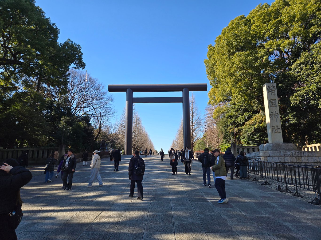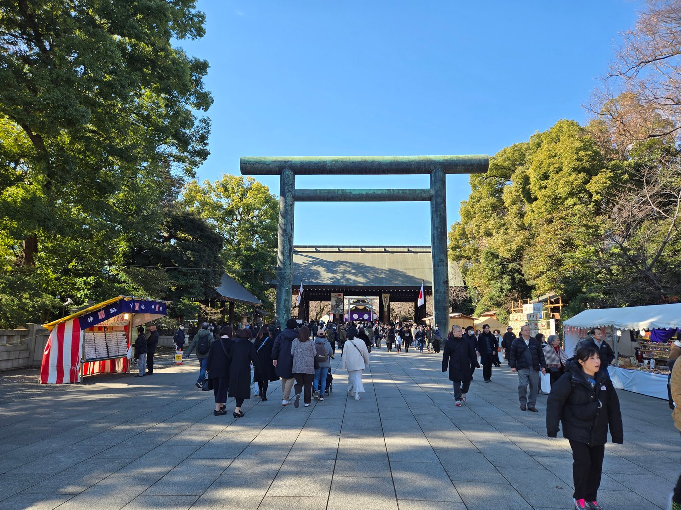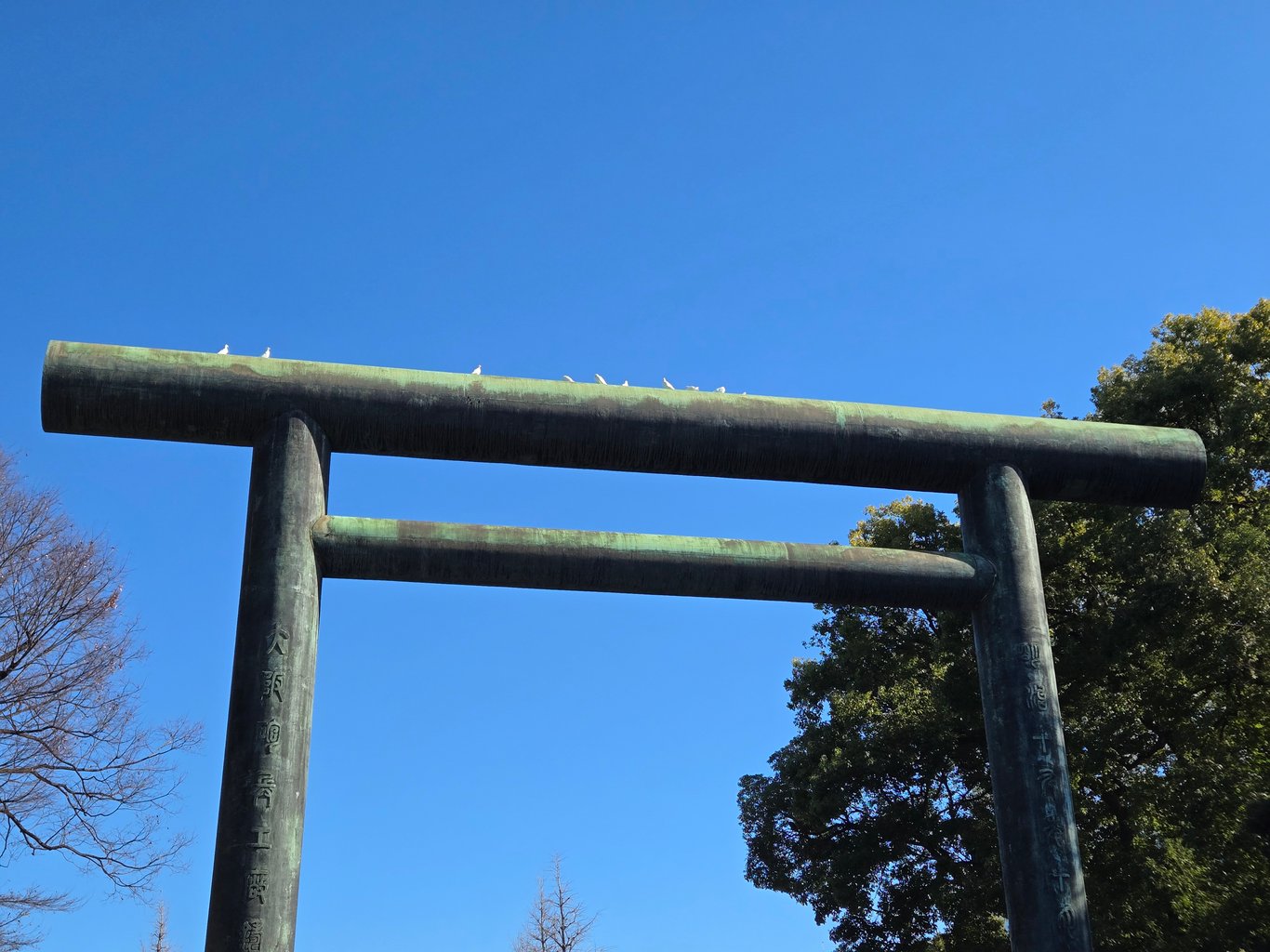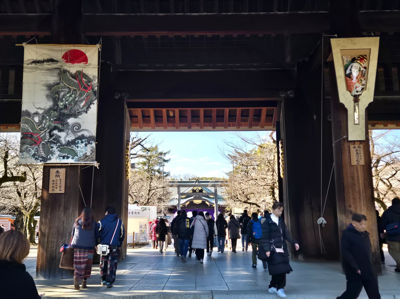 1月1日元旦。其实没什么地方可去,但惯例地,要去给寒假回国的友人带靖国神社的新年签,因此上午去靖国神社。人不多,大略是日本人新年夜里折腾,上午比较晚,未起。靖国神社门口有一排人在宣传,过年放假还出来搞政治活动,只有佩服。不过人不多,一部分是法轮功,另一部分是右翼,似乎高市上台后右翼更活跃了,一个大叔在那里排了一面宣传,宣传大日本帝国的功德,其内容作为中国人看着真的感觉很亲切——一个模子里刻出来的。还热情地给我塞了传单。新年这天,靖国神社不知为何有很多鸟,铜鸟居上还停了一串白鸽。