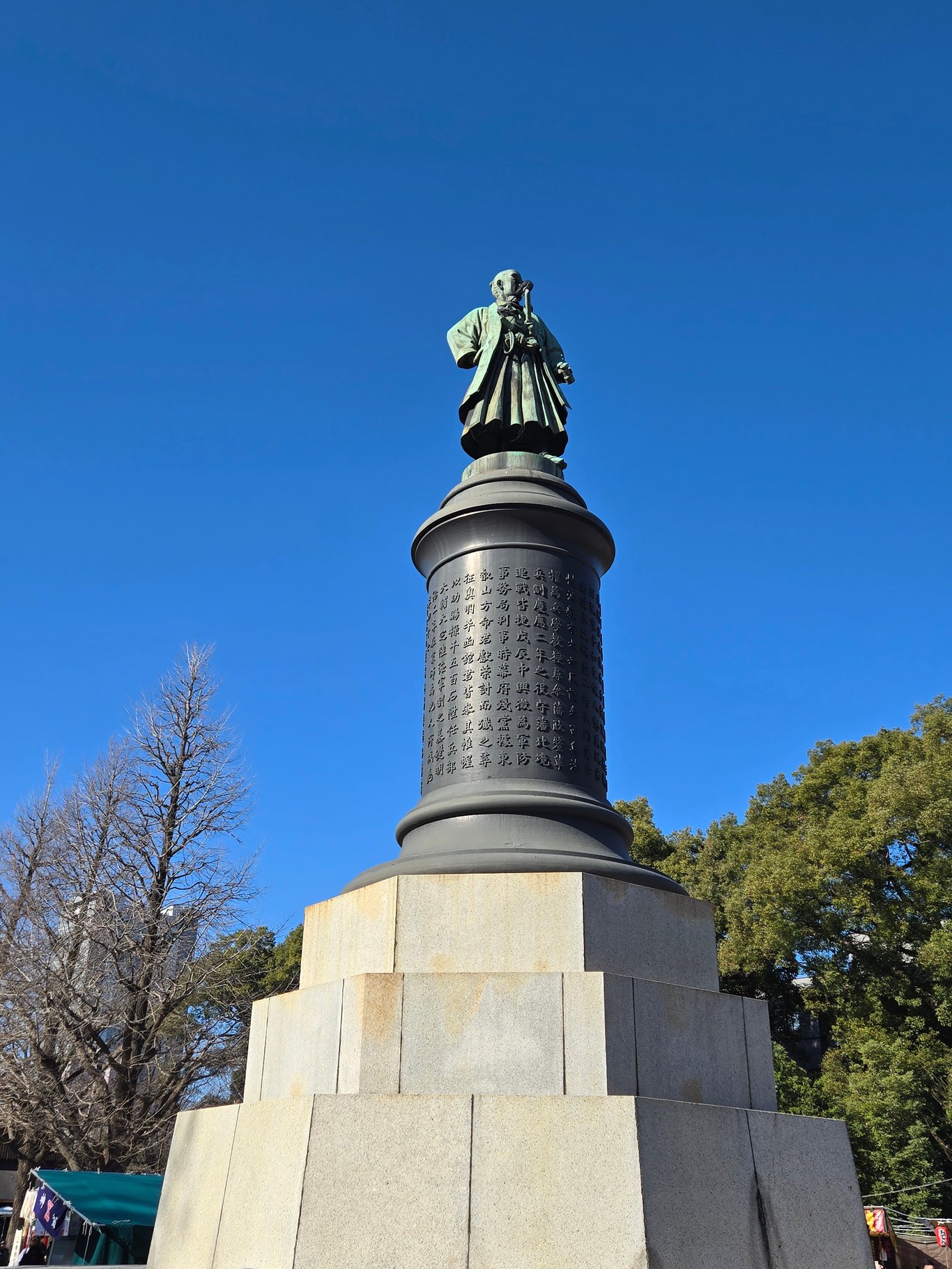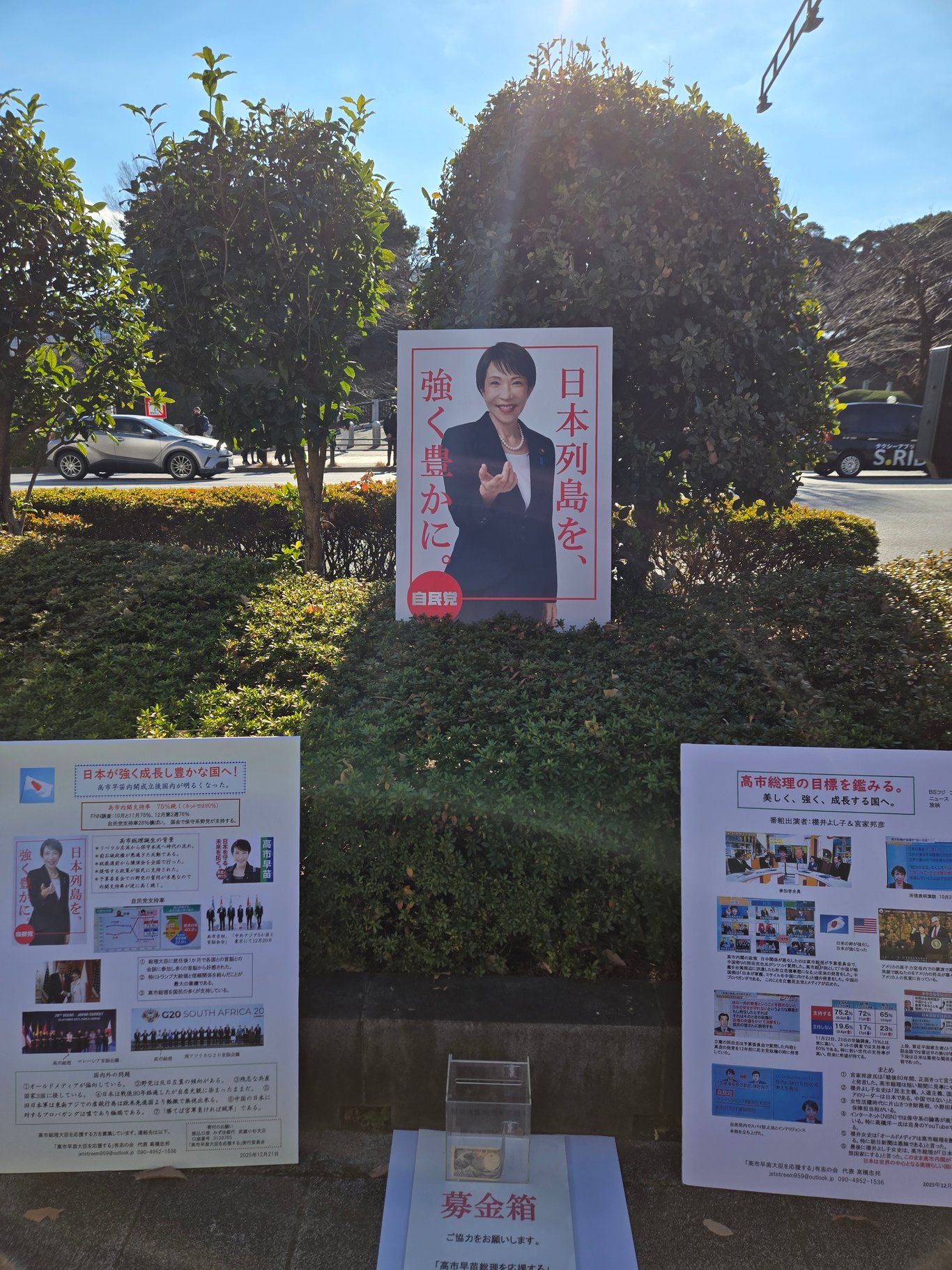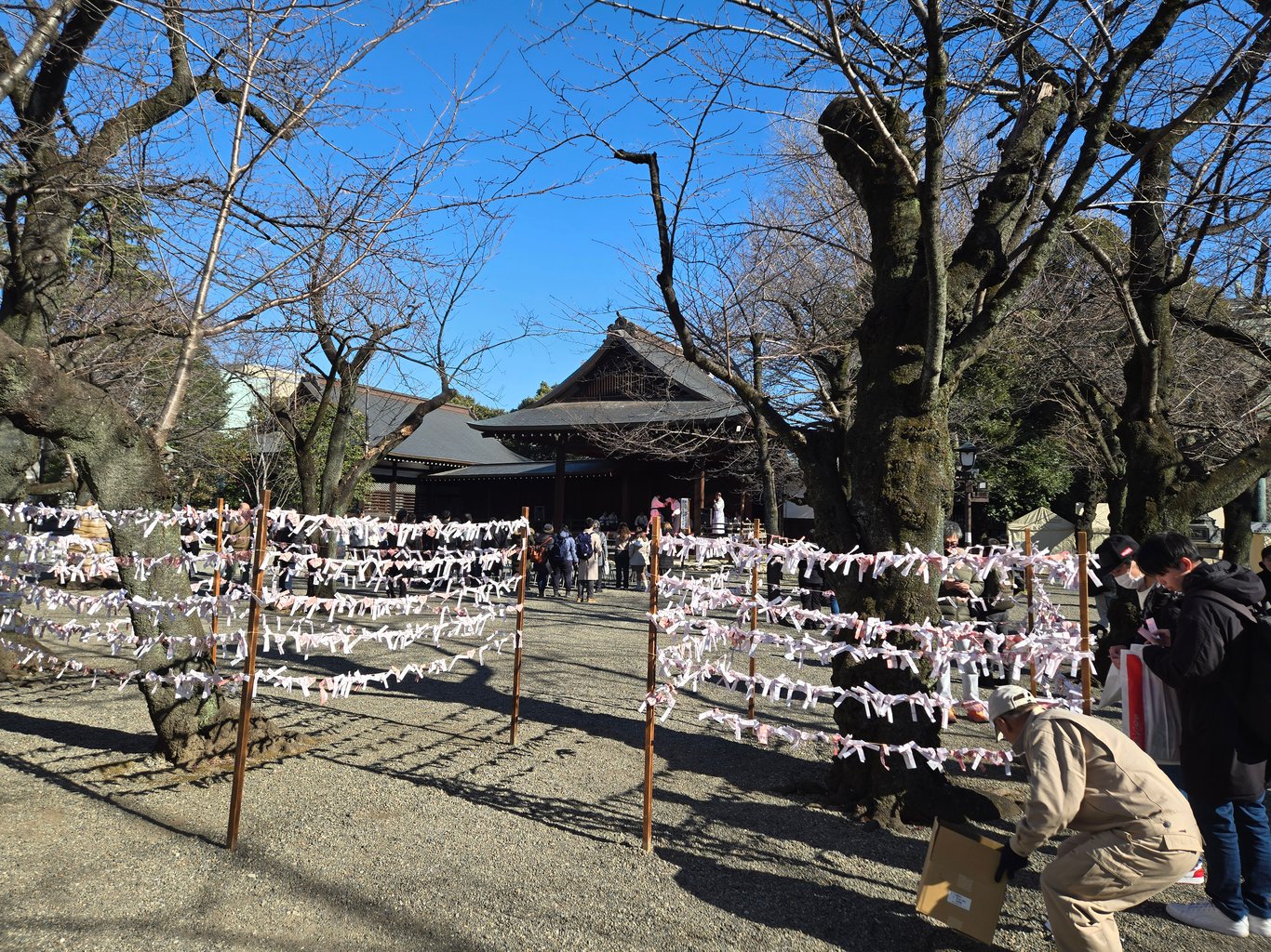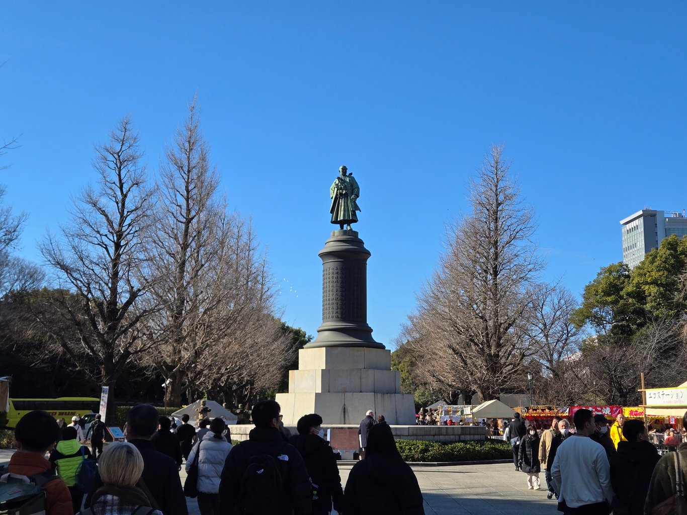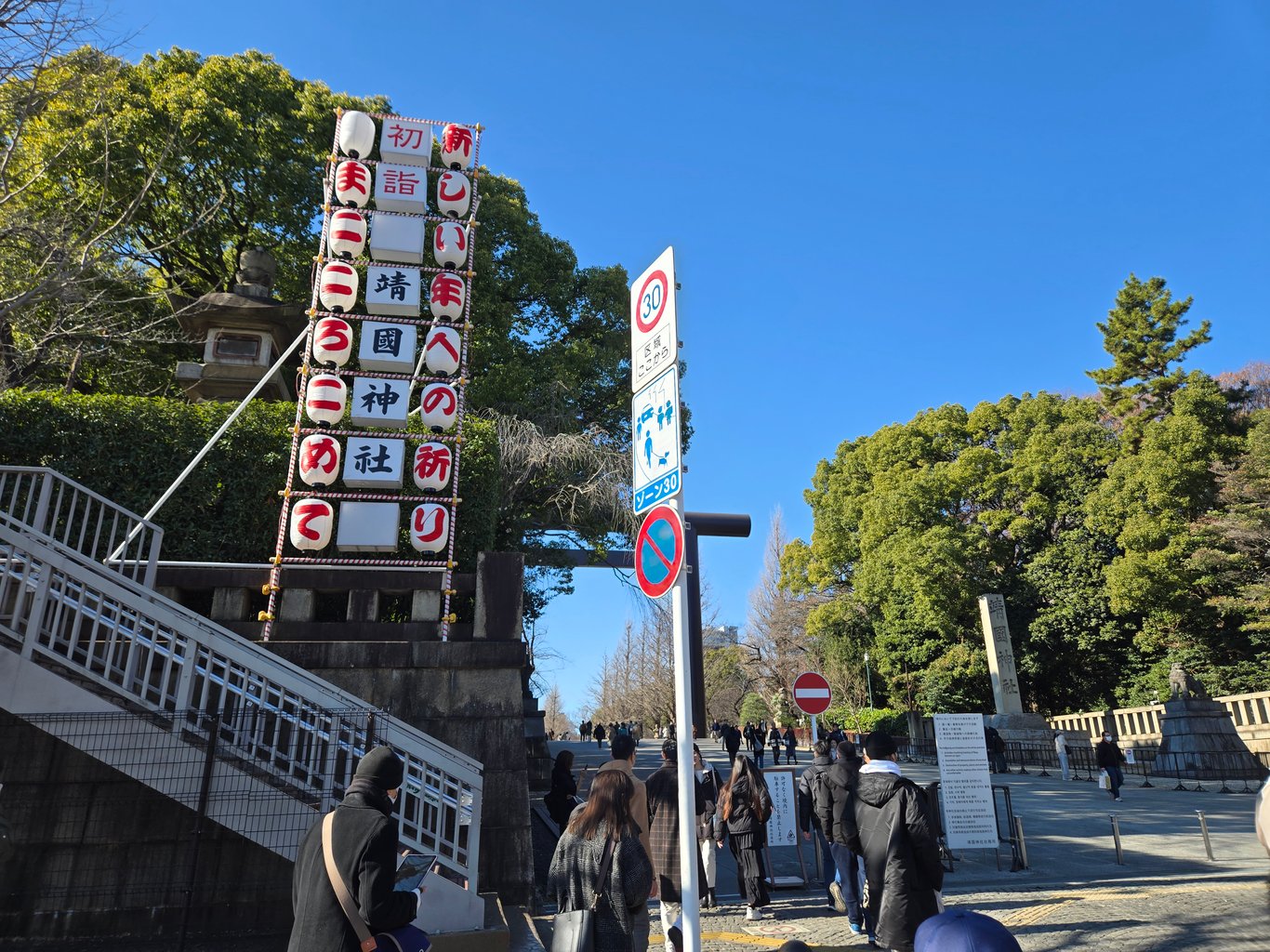 1月1日元旦。其实没什么地方可去,但惯例地,要去给寒假回国的友人带靖国神社的新年签,因此上午去靖国神社。人不多,大略是日本人新年夜里折腾,上午比较晚,未起。靖国神社门口有一排人在宣传,过年放假还出来搞政治活动,只有佩服。不过人不多,一部分是法轮功,另一部分是右翼,似乎高市上台后右翼更活跃了,一个大叔在那里排了一面宣传,宣传大日本帝国的功德,其内容作为中国人看着真的感觉很亲切——一个模子里刻出来的。还热情地给我塞了传单。新年这天,靖国神社不知为何有很多鸟,铜鸟居上还停了一串白鸽。