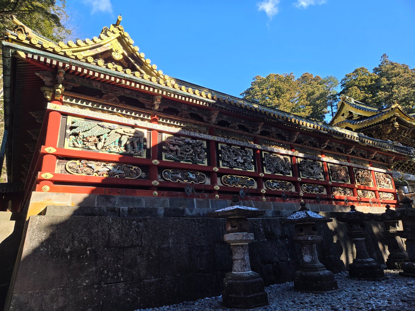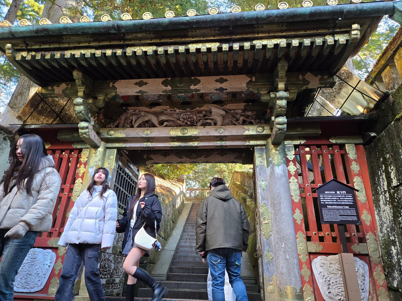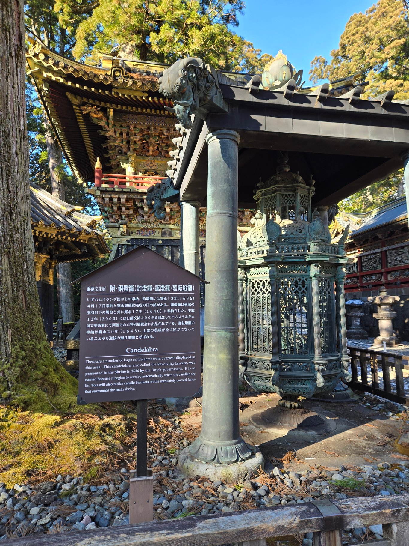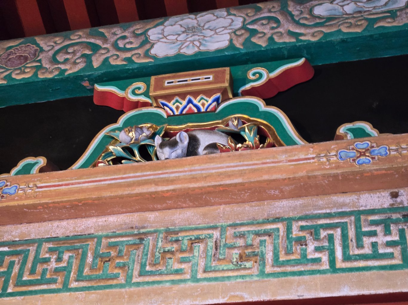 过了二进鸟居,著名的阳明门就在眼前。我先打量了一下阳明门周边。外墙的木雕,是真的精美。另一个有趣的东西是17世纪荷兰人送的铁灯笼。门边有个药师堂,包含在轮王寺的联票里。药师堂要脱鞋手拿着进,连个鞋柜都不给,而且里面没有取暖,踩在地板上钻心寒。里面的主要看点是“鸣龙”,画在天花板上的龙。龙倒没什么神奇之处,不过堂内用了一定神学设计,如果你在龙头下方拍板子的话,声音会非常响亮,也是挺神奇的。