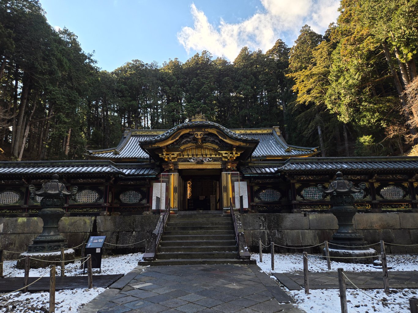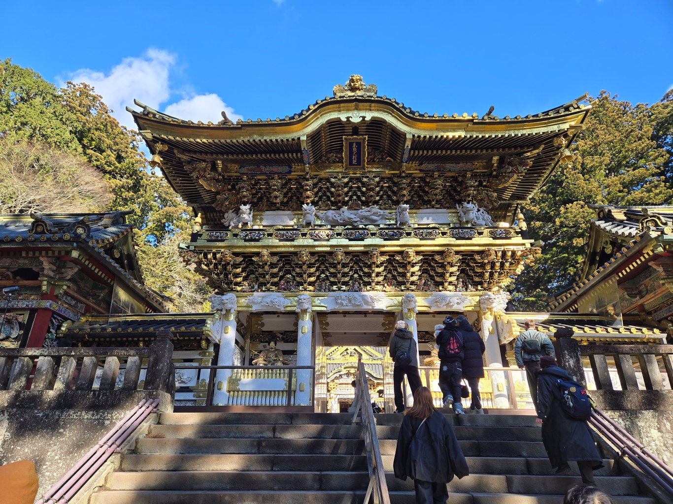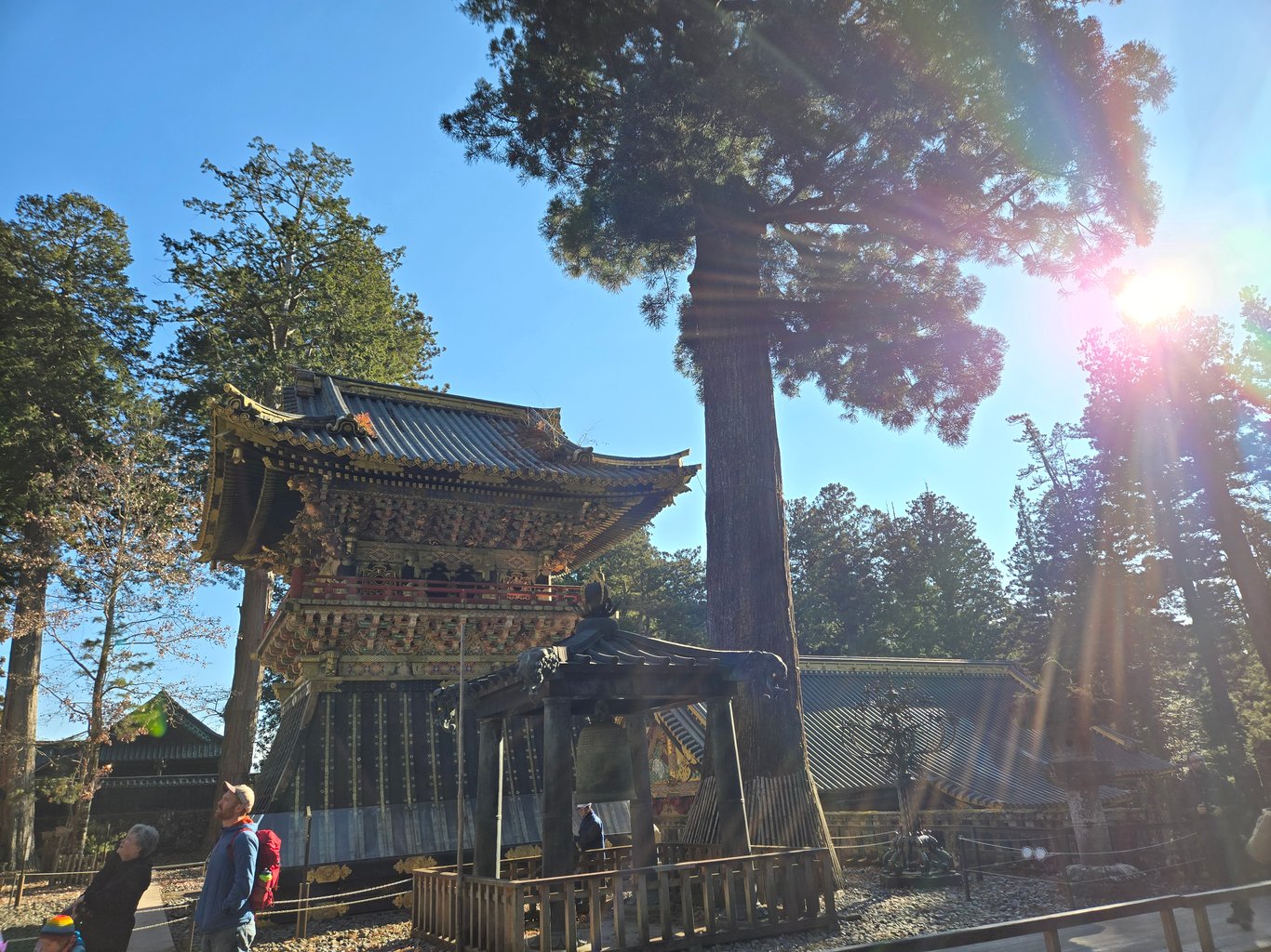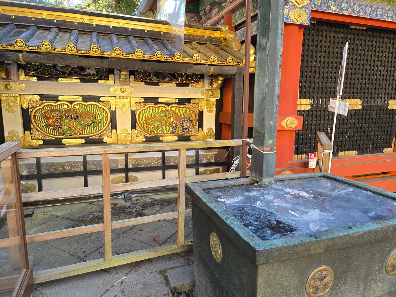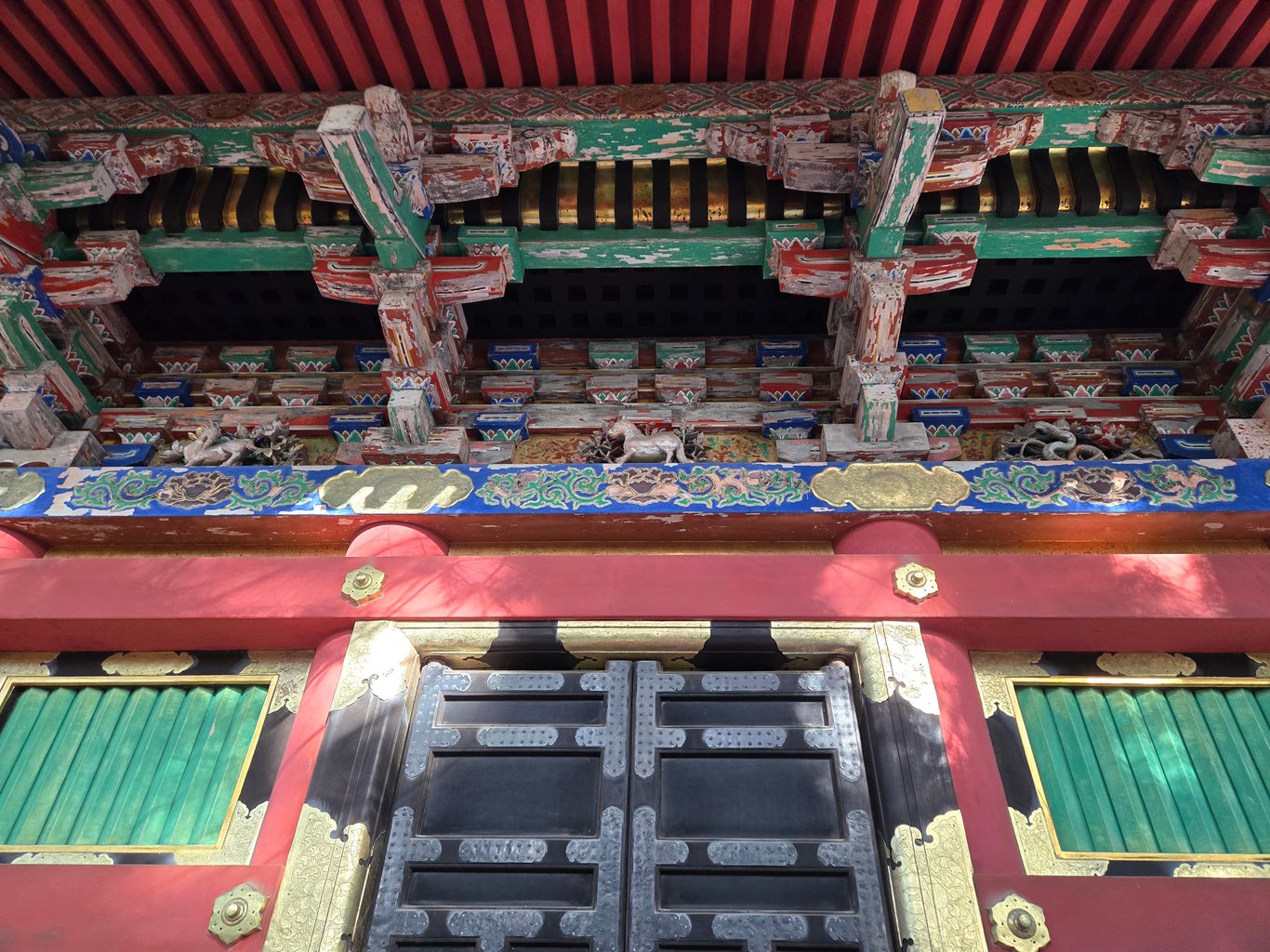 过了二进鸟居,著名的阳明门就在眼前。我先打量了一下阳明门周边。外墙的木雕,是真的精美。另一个有趣的东西是17世纪荷兰人送的铁灯笼。门边有个药师堂,包含在轮王寺的联票里。药师堂要脱鞋手拿着进,连个鞋柜都不给,而且里面没有取暖,踩在地板上钻心寒。里面的主要看点是“鸣龙”,画在天花板上的龙。龙倒没什么神奇之处,不过堂内用了一定神学设计,如果你在龙头下方拍板子的话,声音会非常响亮,也是挺神奇的。