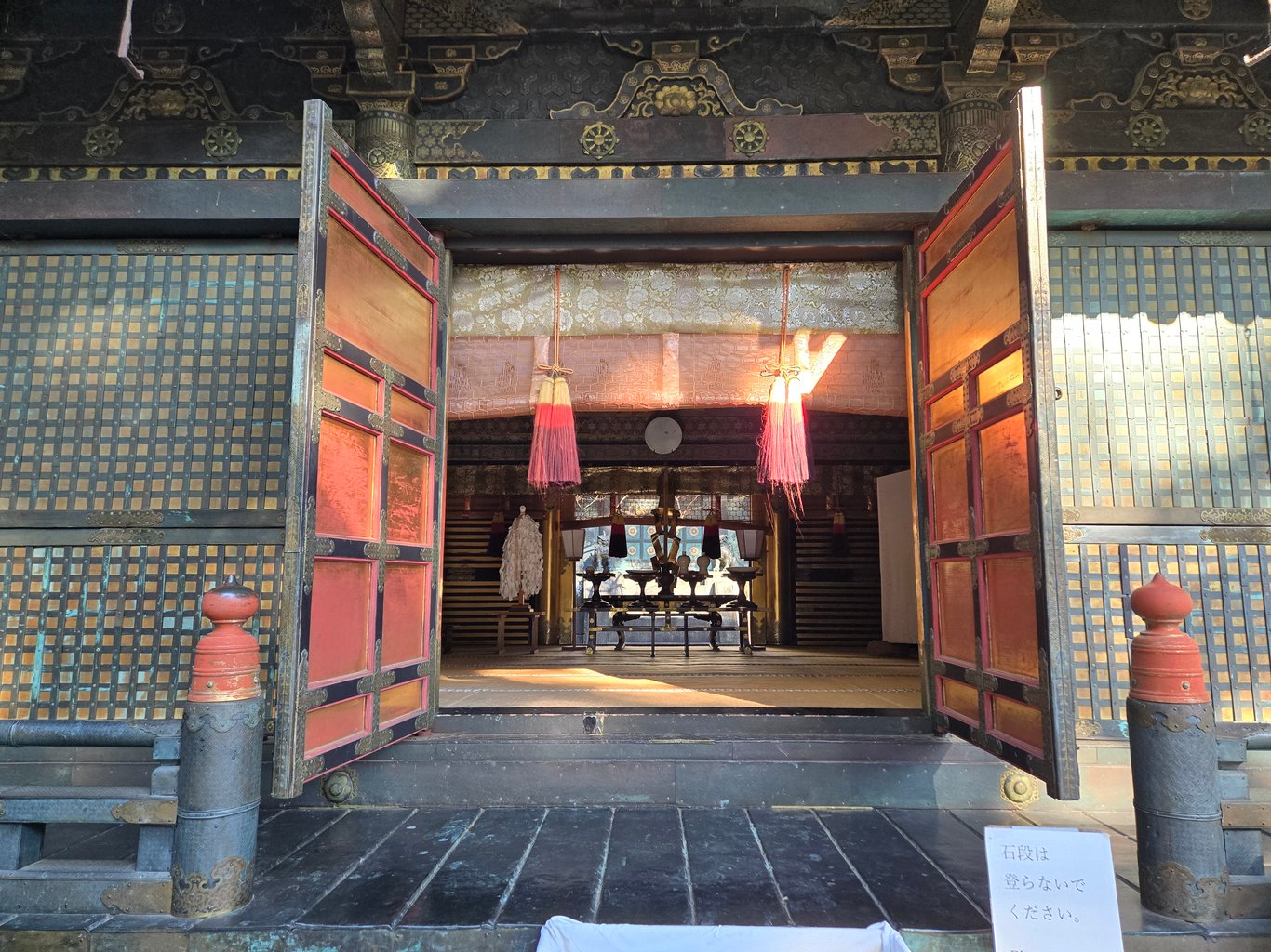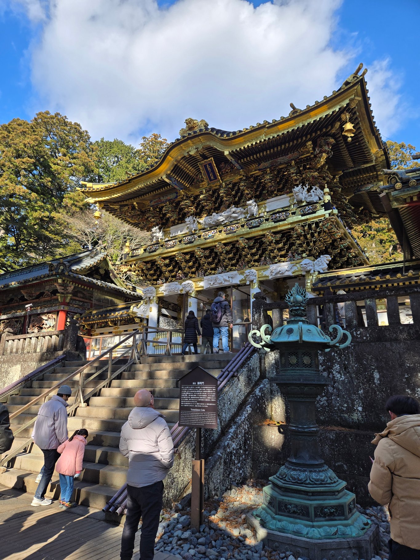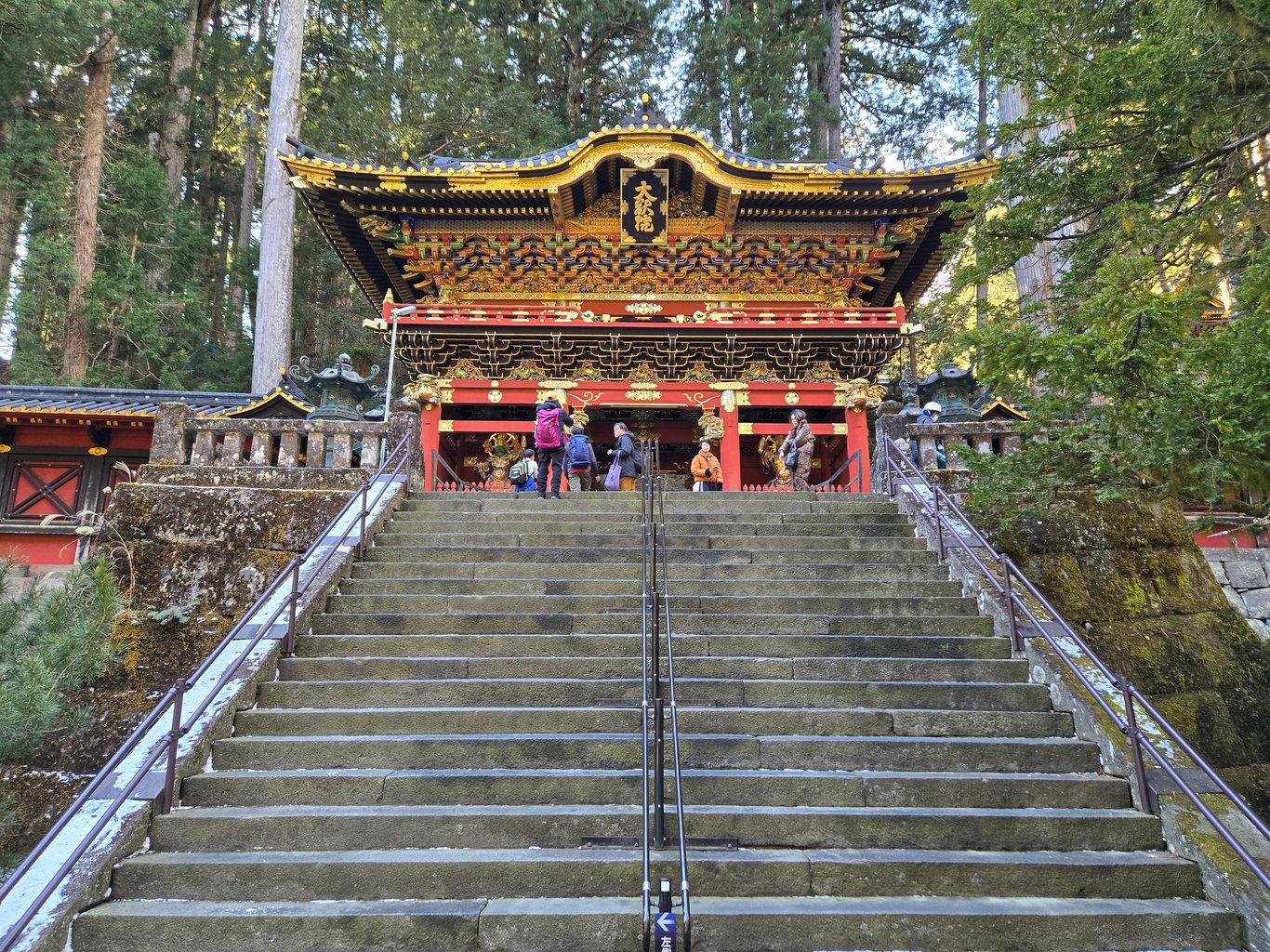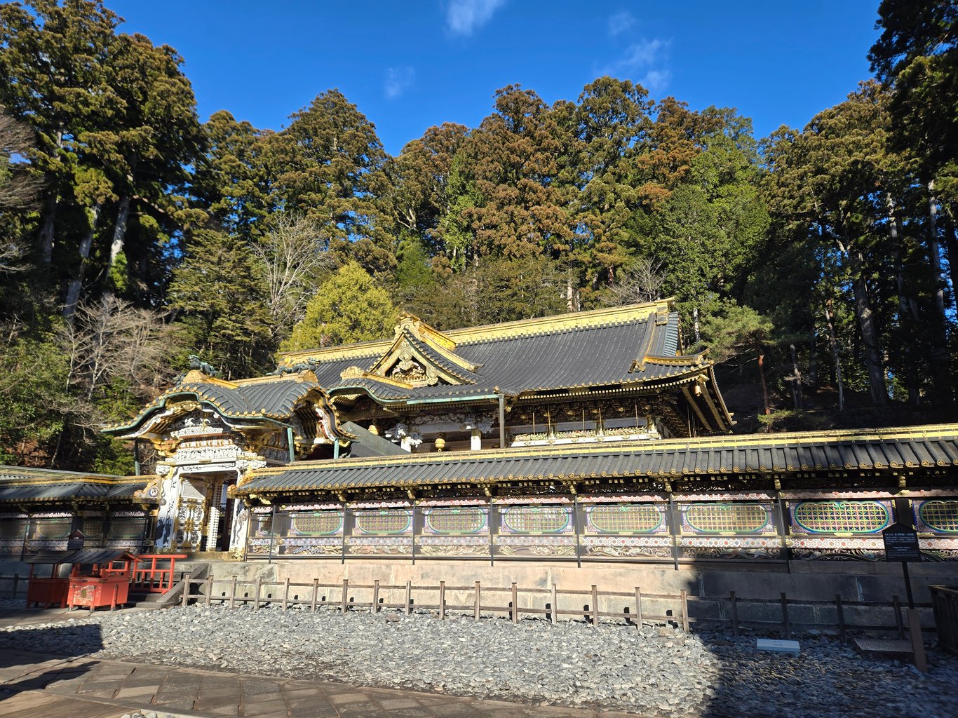 过了二进鸟居,著名的阳明门就在眼前。我先打量了一下阳明门周边。外墙的木雕,是真的精美。另一个有趣的东西是17世纪荷兰人送的铁灯笼。门边有个药师堂,包含在轮王寺的联票里。药师堂要脱鞋手拿着进,连个鞋柜都不给,而且里面没有取暖,踩在地板上钻心寒。里面的主要看点是“鸣龙”,画在天花板上的龙。龙倒没什么神奇之处,不过堂内用了一定神学设计,如果你在龙头下方拍板子的话,声音会非常响亮,也是挺神奇的。