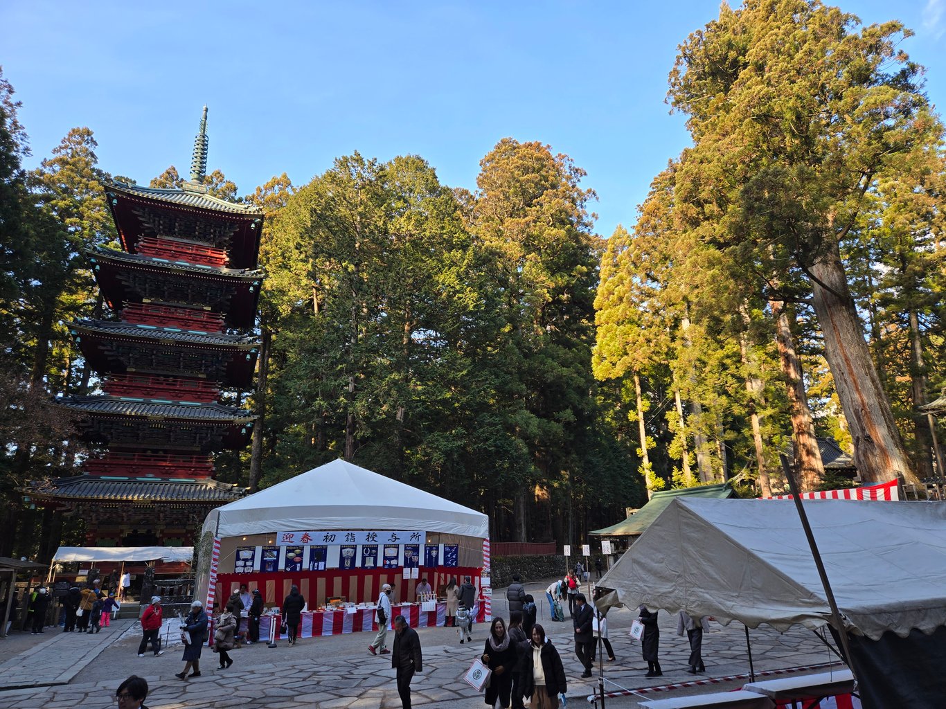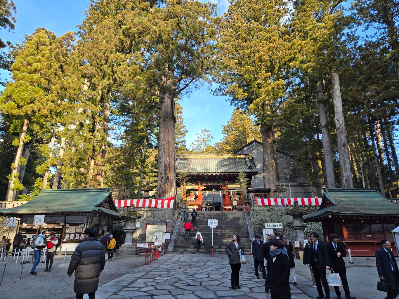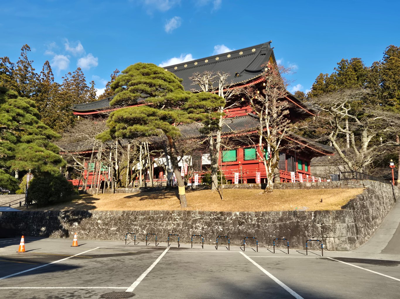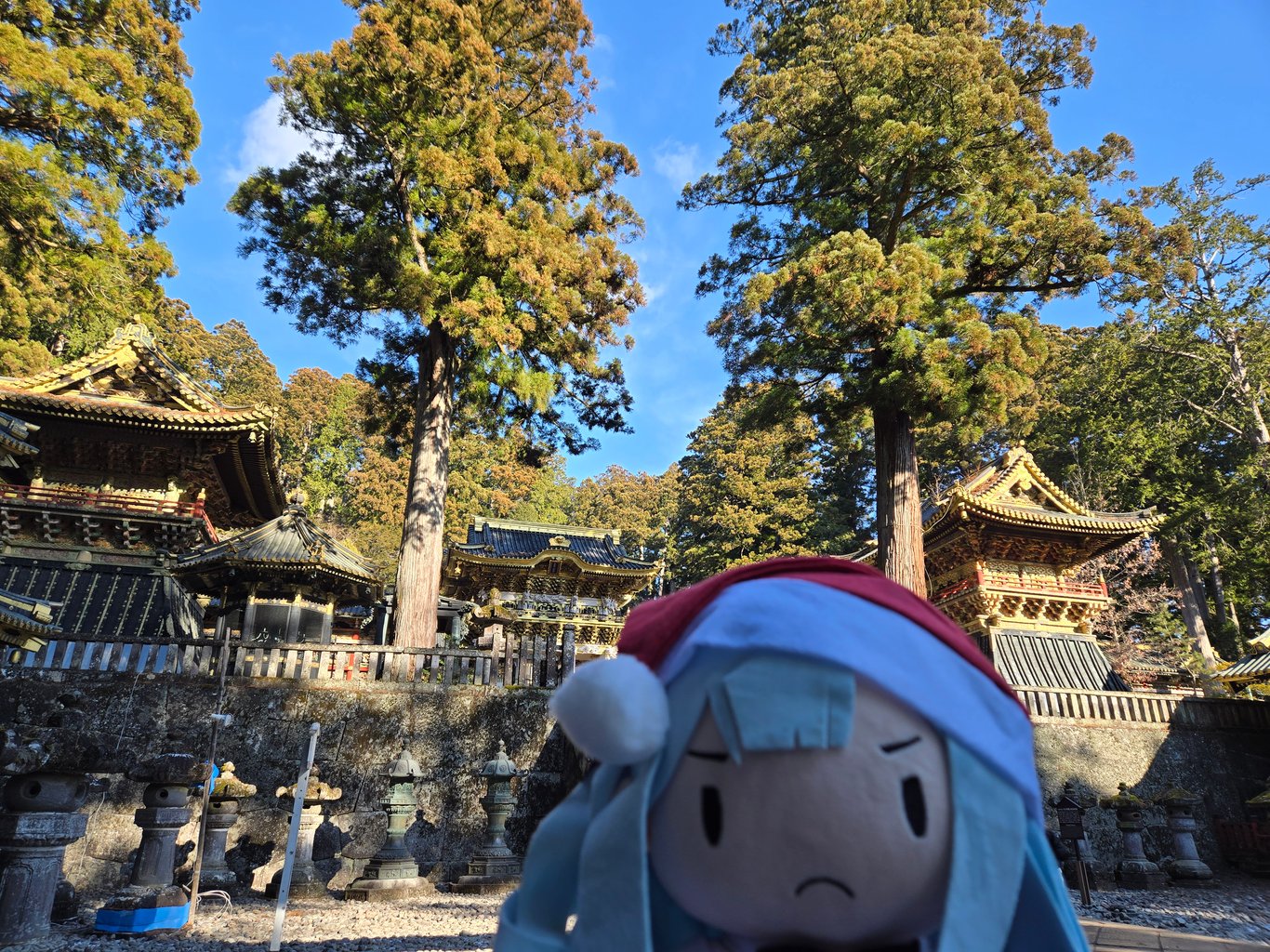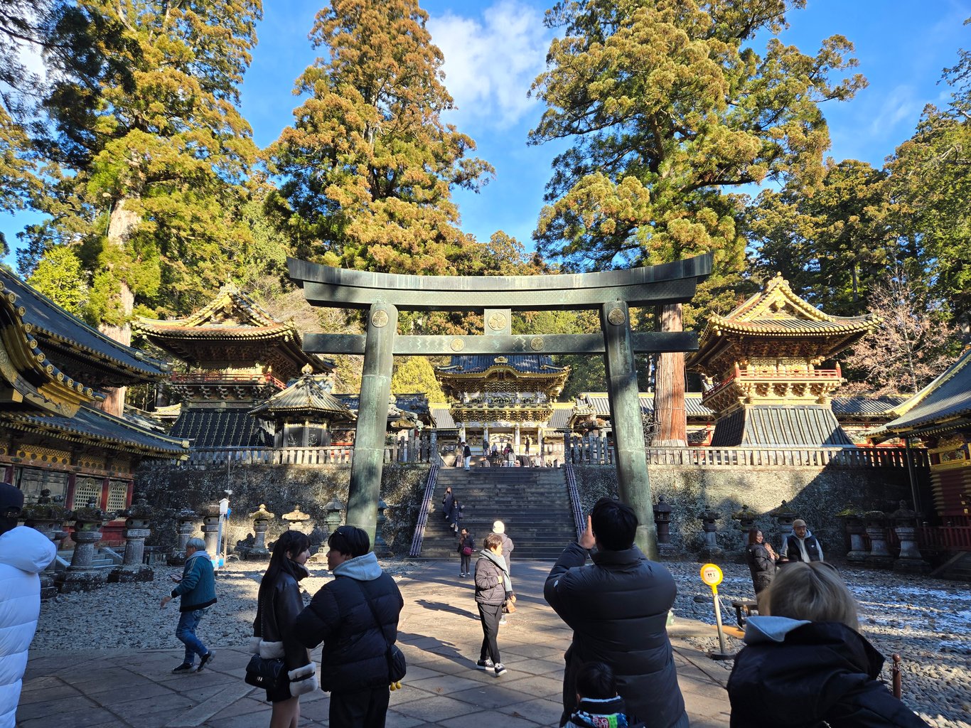 过了二进鸟居,著名的阳明门就在眼前。我先打量了一下阳明门周边。外墙的木雕,是真的精美。另一个有趣的东西是17世纪荷兰人送的铁灯笼。门边有个药师堂,包含在轮王寺的联票里。药师堂要脱鞋手拿着进,连个鞋柜都不给,而且里面没有取暖,踩在地板上钻心寒。里面的主要看点是“鸣龙”,画在天花板上的龙。龙倒没什么神奇之处,不过堂内用了一定神学设计,如果你在龙头下方拍板子的话,声音会非常响亮,也是挺神奇的。