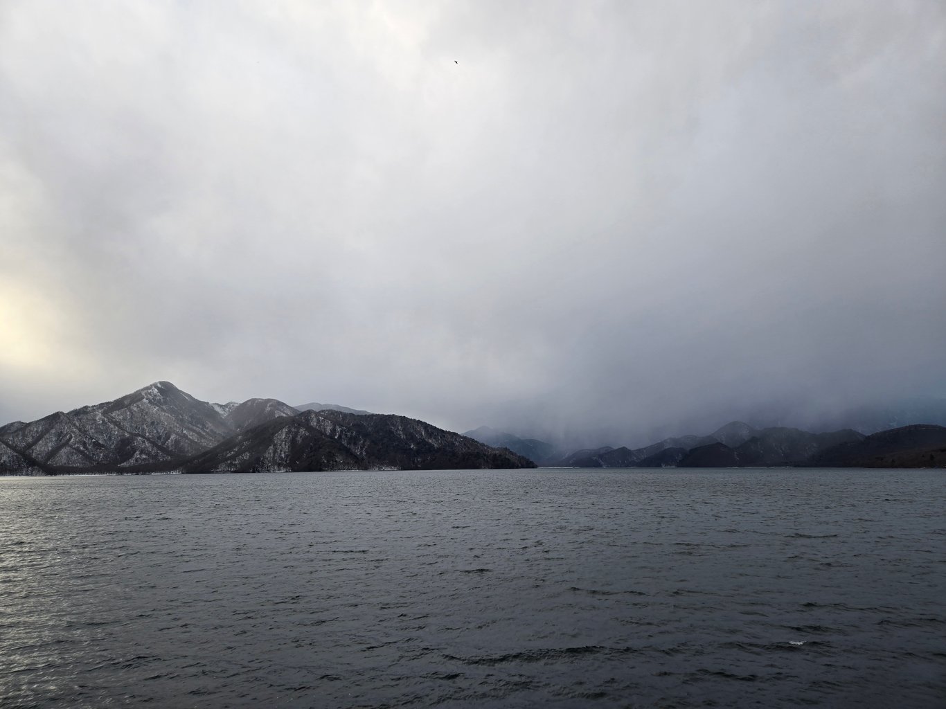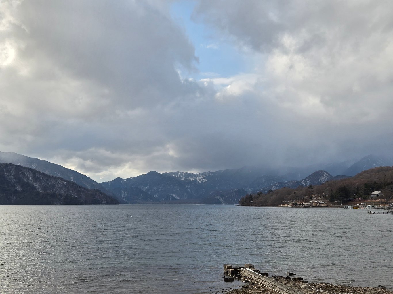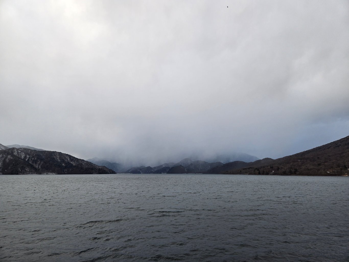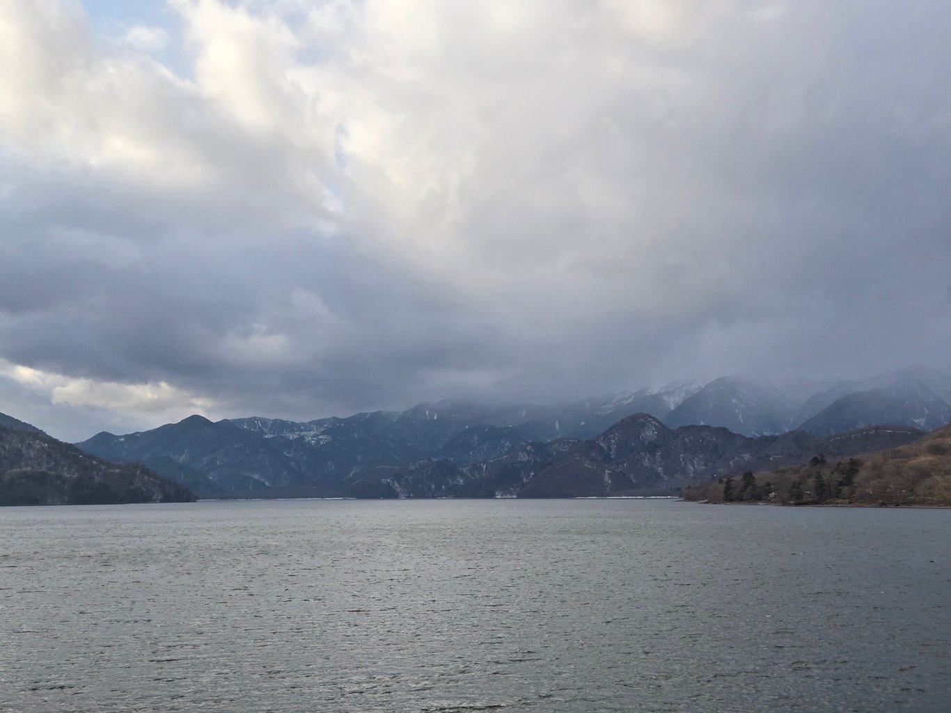 接下来自然要去中禅寺湖。下午天逐渐阴起来,甚至下起了小雪。远处是笼罩子啊铅灰色烟雾中的男体山,而在中禅寺湖边,蓝灰色的厚重的云层盖满天空,远方是蓝灰色的积雪山脊。高地湖泊的美,我当时感觉自己似乎在想象中的南美群山里。